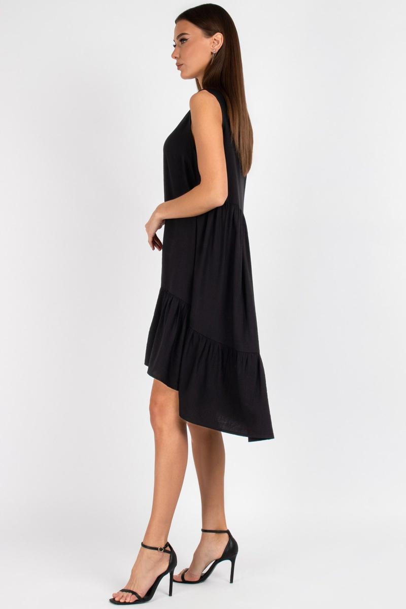 "Платье женское с нагрудными вытачками по переду. Спинка отрезная по линии талии. Низ переда и спинки оформлен фигурной линией с притачным воланом. Круглый вырез горловины. Платье без рукавов. Уход: бережная стирка при температуре не выше 30°C."