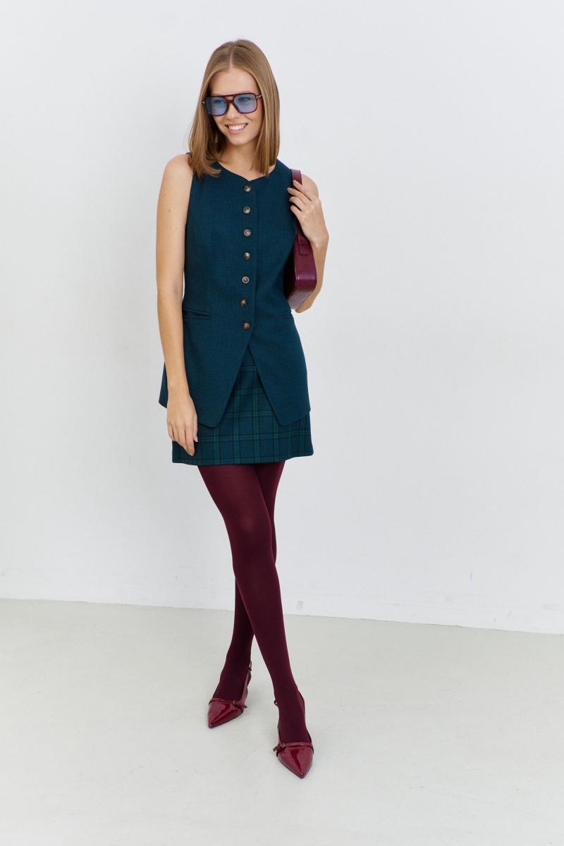 Юбка женская, из костюмно-плательной ткани, короткая, на обтачке, с застежкой на потайную молнию, расположенную в среднем шве. Переднее и заднее полотнище юбки с талиевыми вытачками. Заднее полотнище юбки с средним швом. Юбка на подкладке.