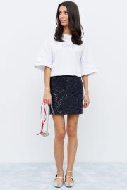 Юбка в длине мини из костюмной ткани, на подкладке. Юбка декорирована кружевом с добавлением пайеток. Юбка на подкладке, с застежкой на потайную молнию в среднем шве