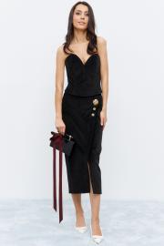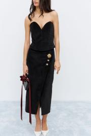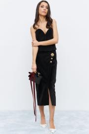 Юбка из ткани с эффектом бархата, в черном цвете. По переду юбки разрез, юбка на запах, декорирована тремя декоративными пуговицами. Юбка на поясе. В запахе изделия пзастежка на молнию.