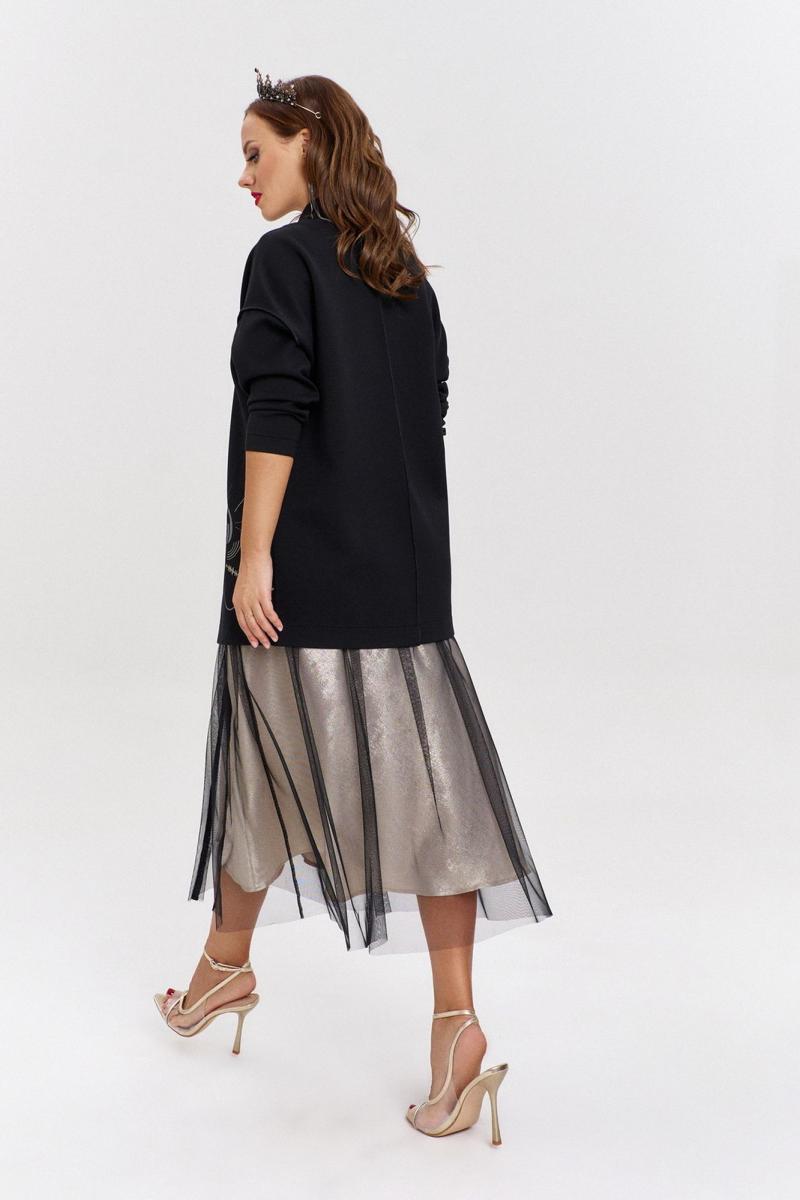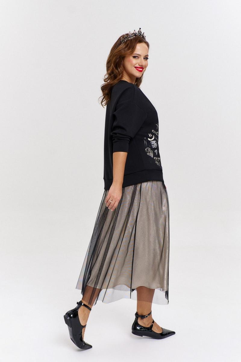 Нарядная двухслойная юбка, расширенного силуэта, длиной миди. Нижняя юбка из струящегося шелка, скроена по косой. Верхняя из полупрозрачной сетки, с разрезом спереди, отделанным мерцающей лентой. Пояс - декоративная резинка.