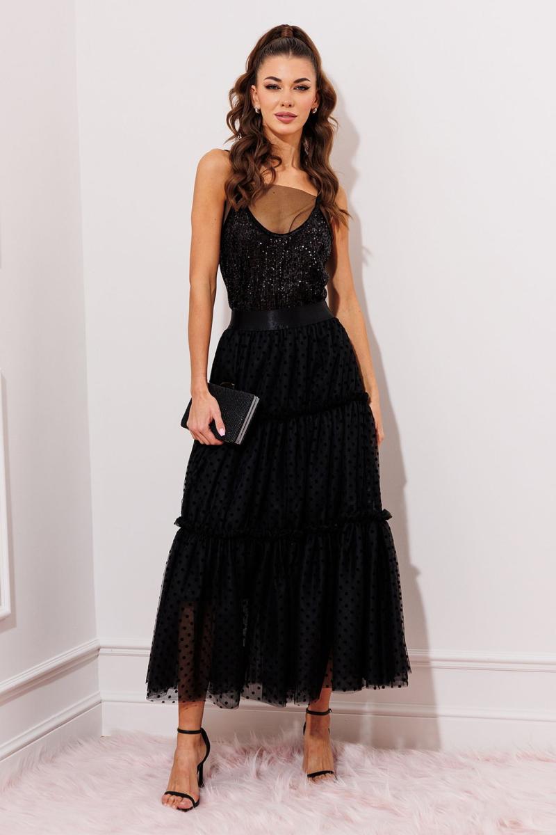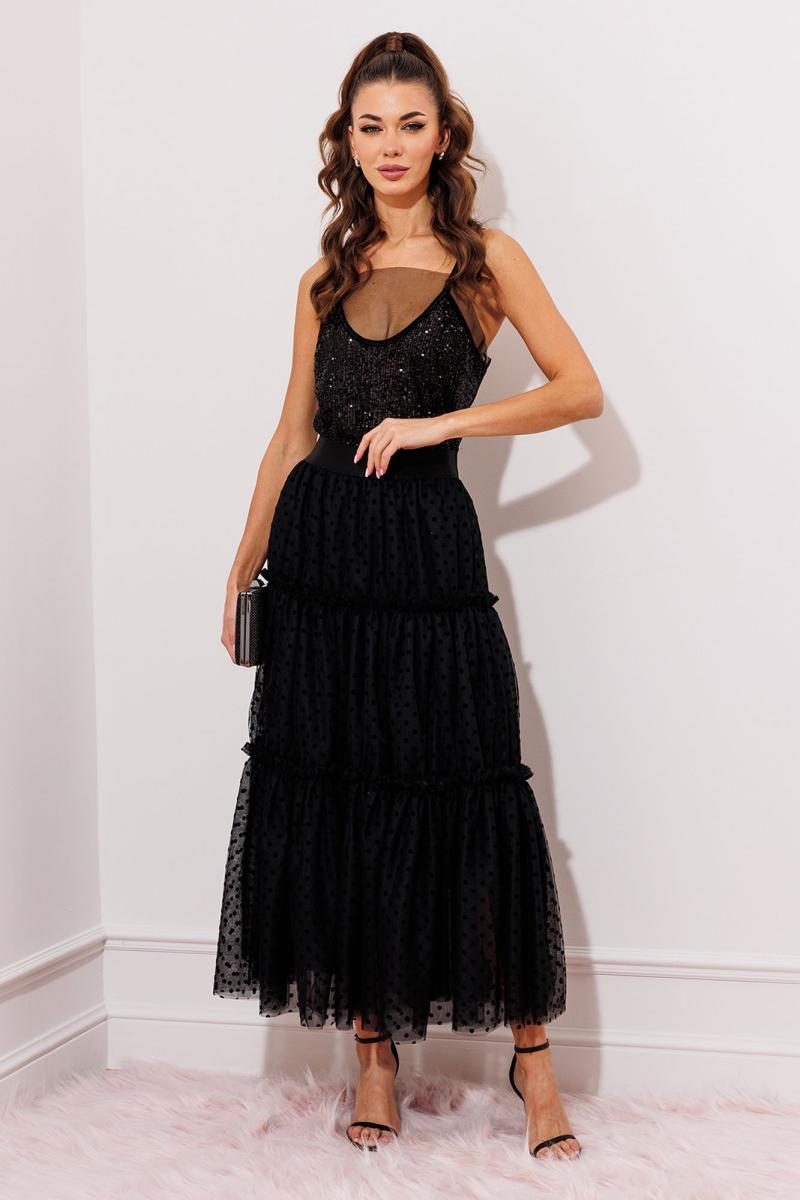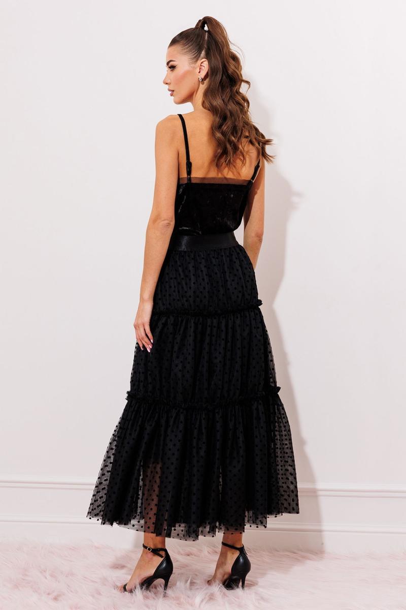 Юбка из фатина и сетки в горошек. Вверху на атласной широкой резинке. С отрезными ярусами со сборкой необработанными швами наружу. Юбка на подкладке.