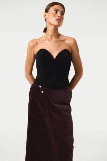 Юбка силуэта трапеция из костюмной ткани длиной макси. Изделие на поясе. Перед со средним швом, прорезными карманами в боковых швах. Спинка со средним швом, отрезной кокеткой, накладными карманами.