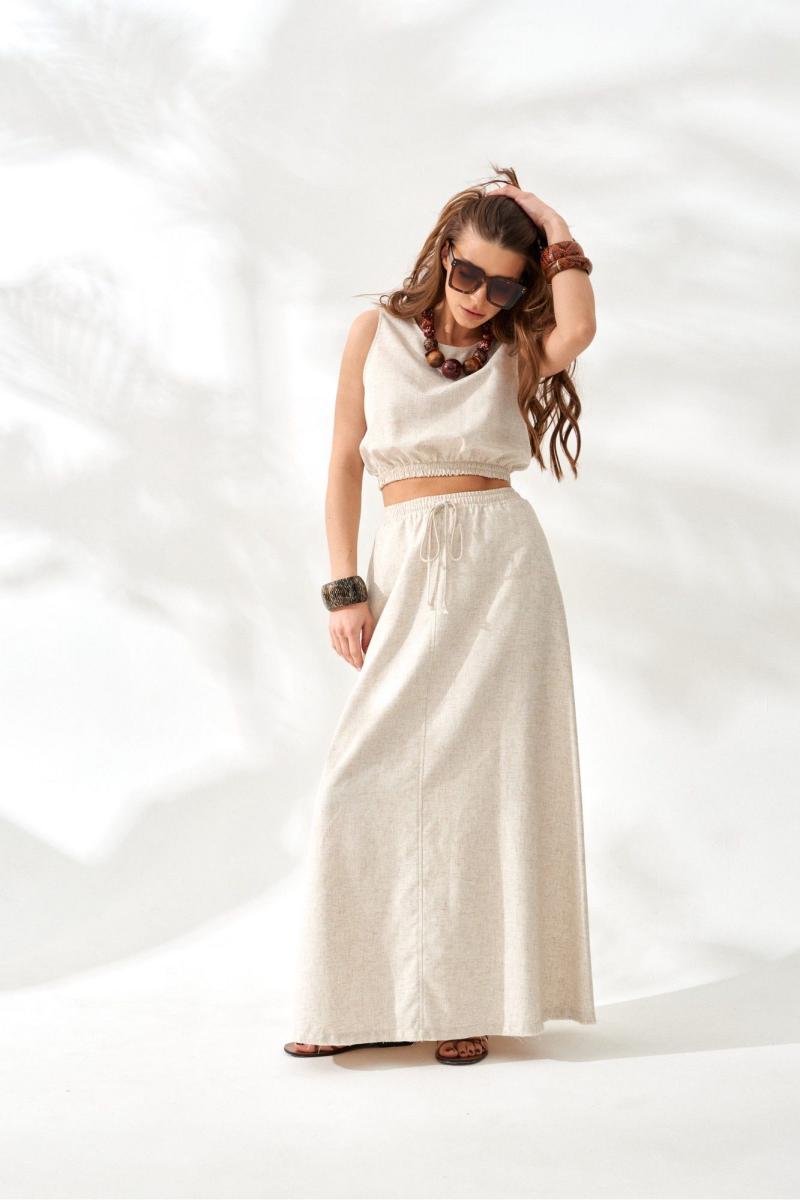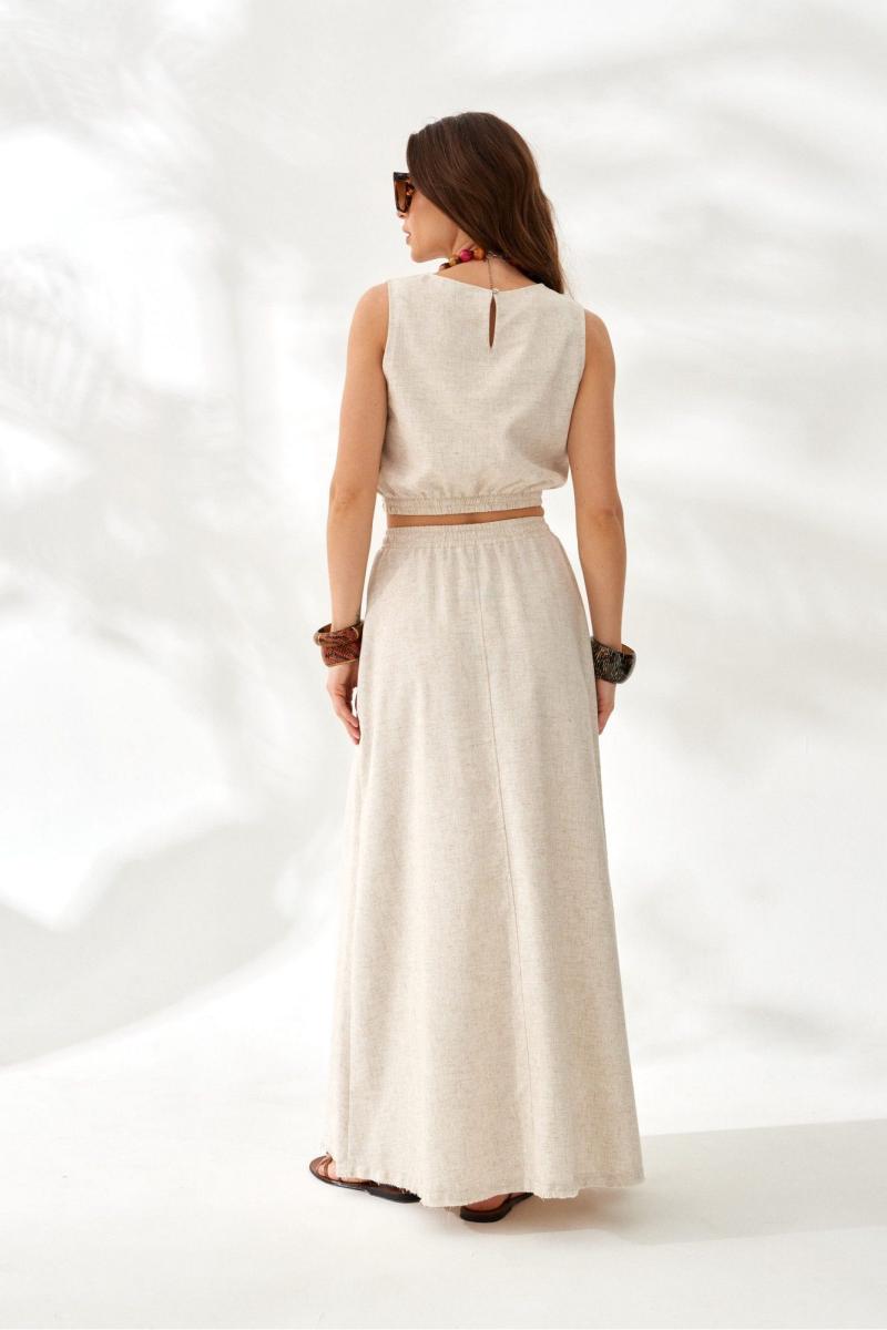 Юбка женская из льняной плательно-костюмной ткани, расклешенная к низу, длиной "макси". Переднее и заднее полотнище со средним швом. В боковых швах функциональные карманы. Пояс притачной на резинке со шнурком из основной ткани. Низ юбки сырой срез с притачной бейкой-бахромой из основной ткани.