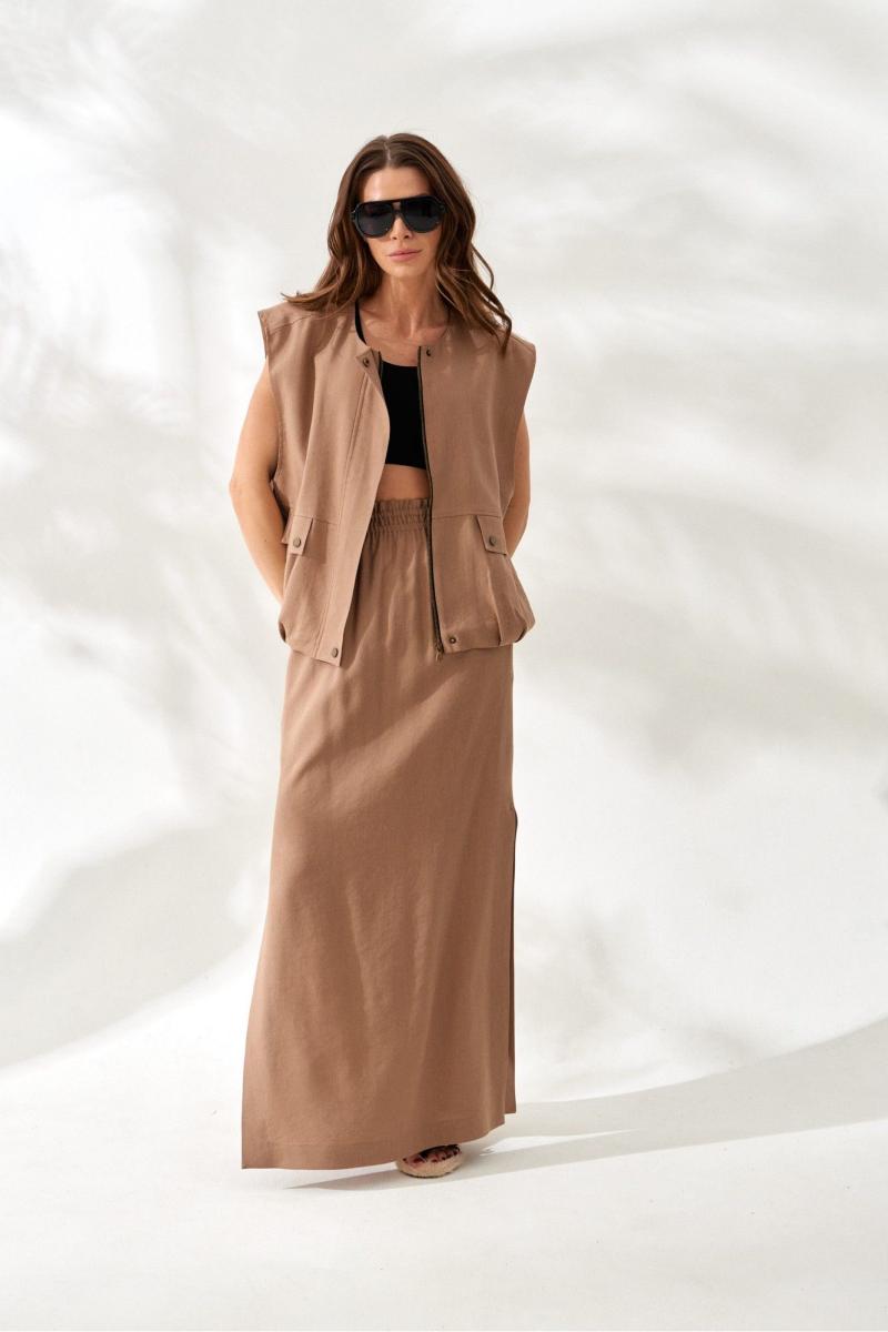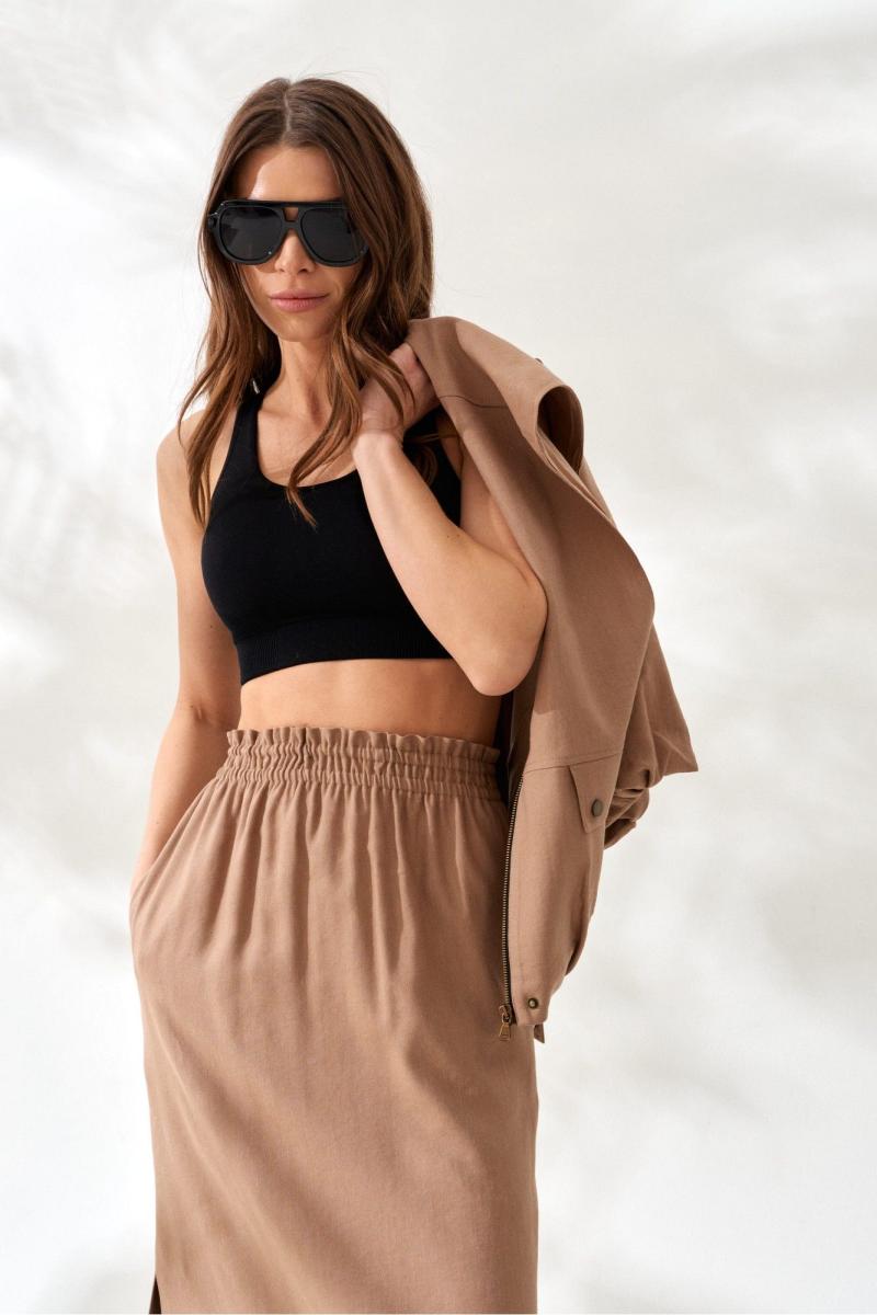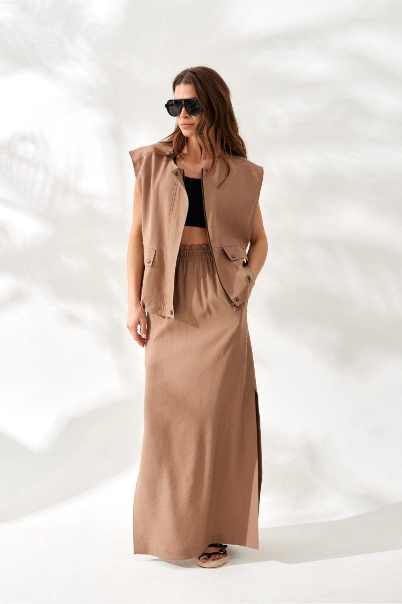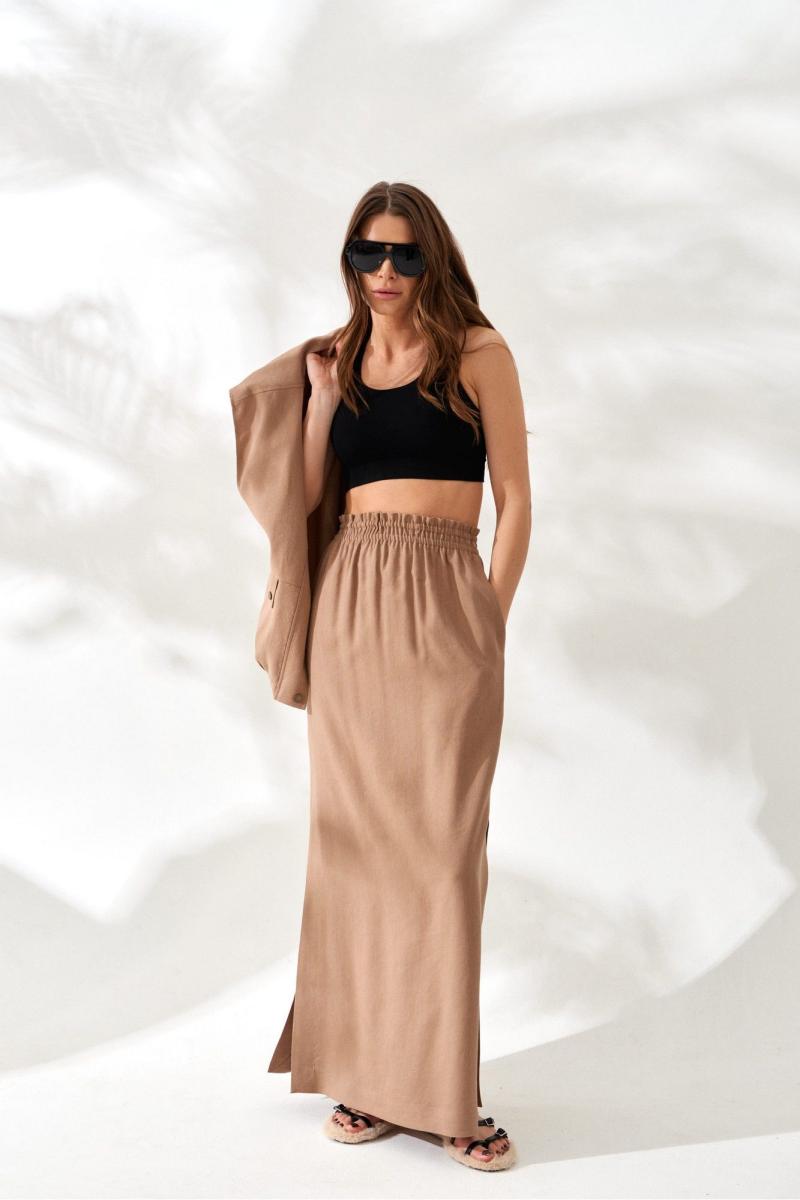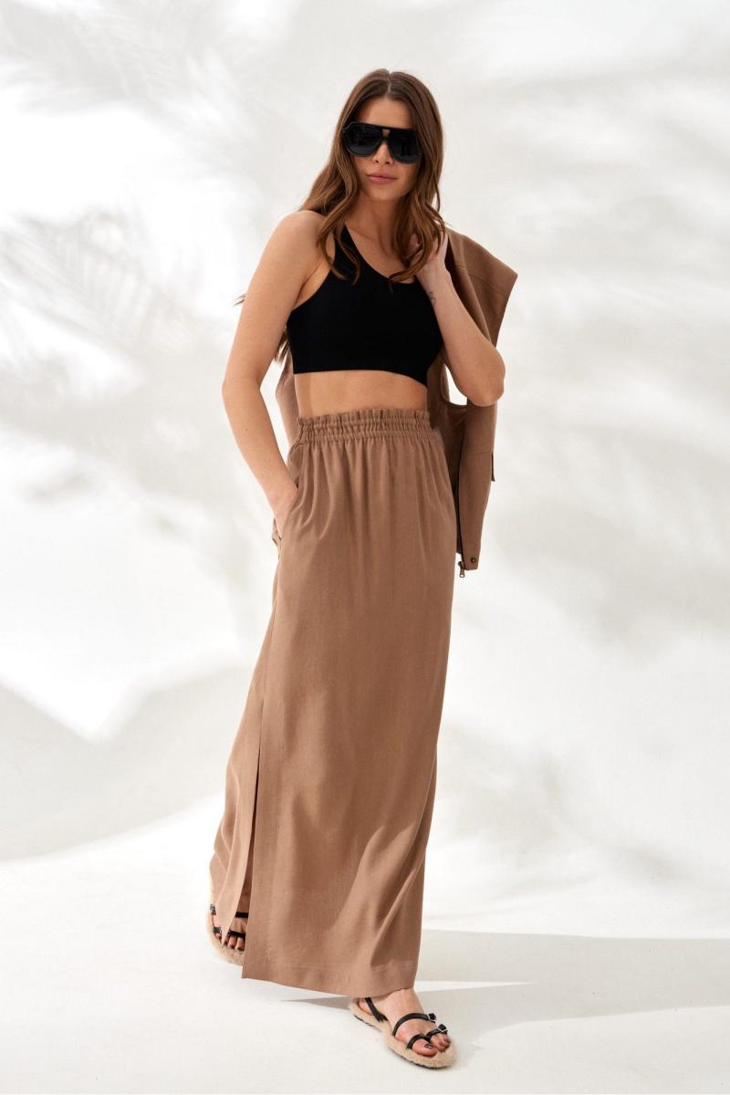 Юбка женская из вискозно-льняной ткани, прямая, с цельнокроенным поясом на резинке, длиной макси, с разрезами по боковым швам. Перед цельный. Спинка со средним швом.