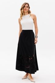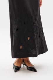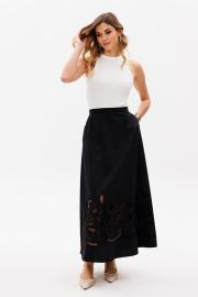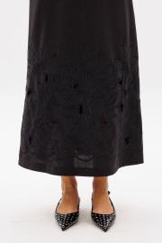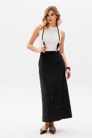 Юбка выполнена из плательной ткани. Юбка А-образного силуэта, длиной миди. Юбка на притачном поясе. Сзади в среднем шве застежка на потайную молнию. В боковых швах карманы с наклонным входом. Юбка декорирована по низу переда вышивкой с перфорацией.