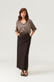 Женская юбка прямого силуэта из поливискозной ткани, идеально подходящая для повседневной носки. Верхний срез юбки оформлен притачным поясом, внутренний край которого украшен декоративной леопардовой тесьмой, добавляющей образу стильный акцент. Застежка выполнена на крючок и дополнена тесьмой-молнией в среднем шве для удобства и надежности. В боковом шве расположены карманы с подкройным бочком, обеспечивающие практичность.