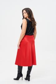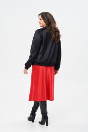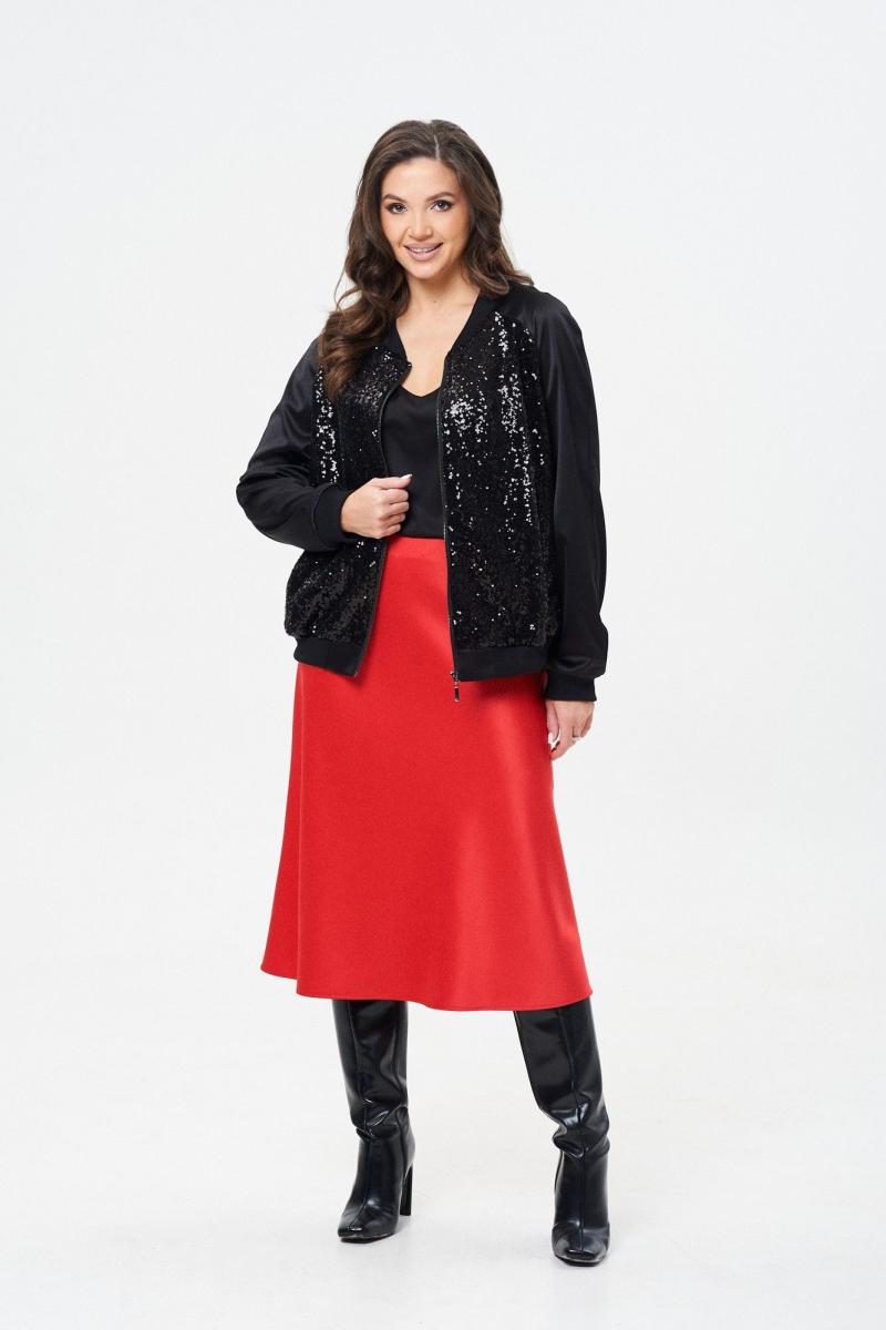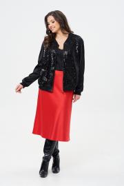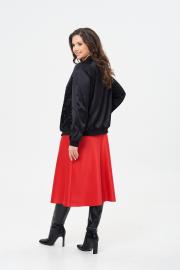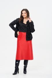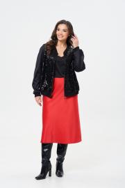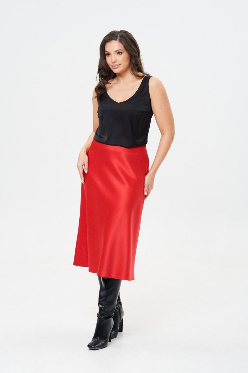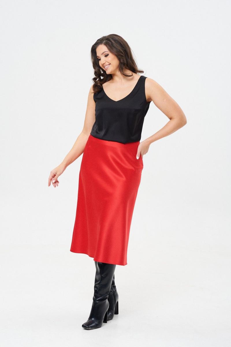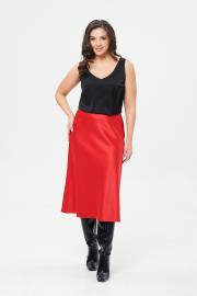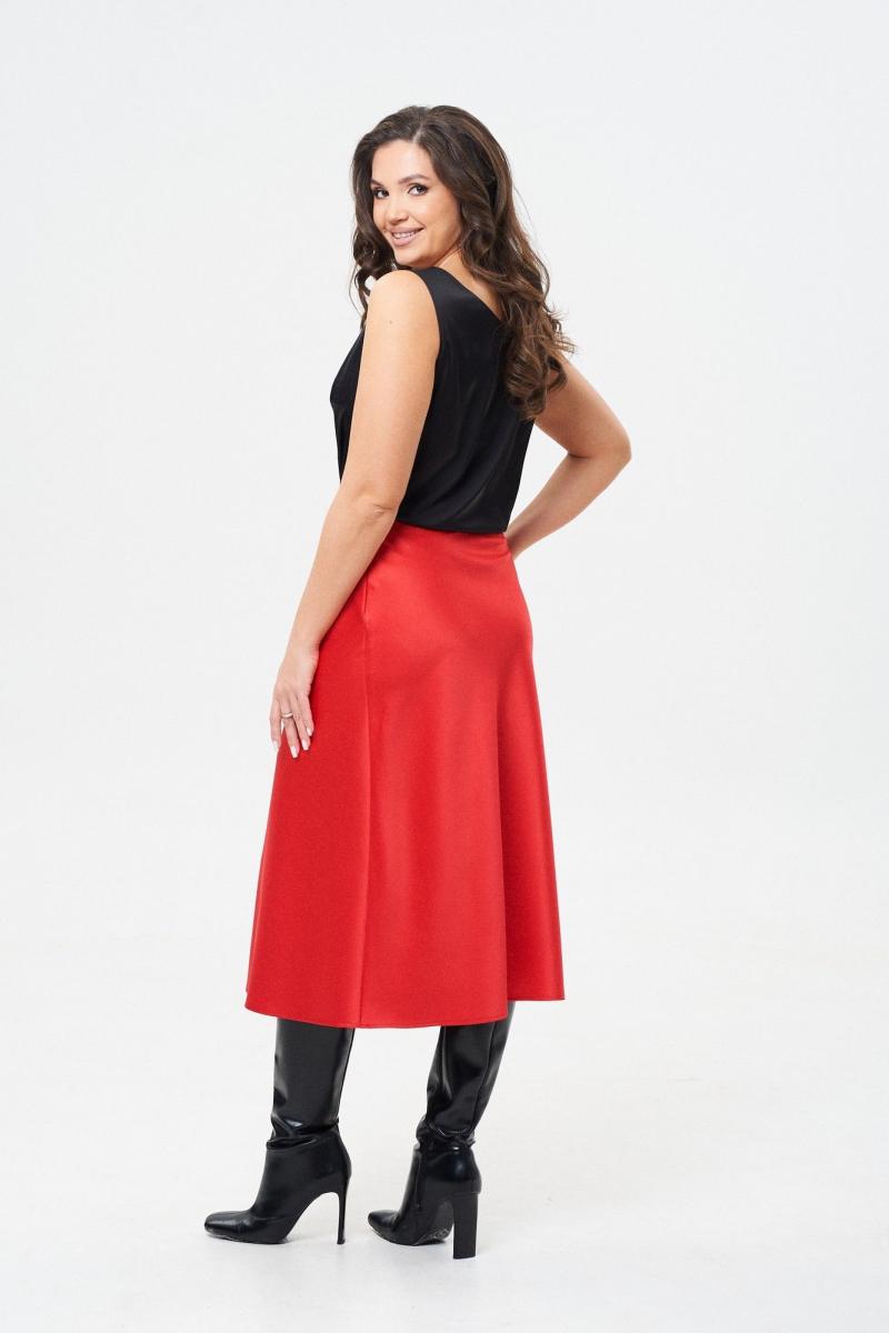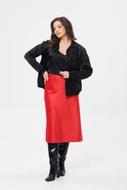 Юбка без подкладки из сатина, по косой, слегка расширенная к низу, с застежкой-«молнией» в боковом шве, верхний срез обработан обтачкой. Длина 80