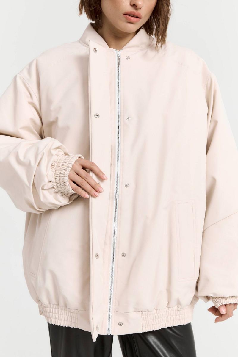 Бомбер в светлом цвете. Выполнен в стиле оверсайз и отлично подойдет для создания актуальных трендовых образов. Бомбер имеет два кармана, воротник-стойку и застежку на кнопках. Рукава бомбера с манжетами на резинке в цвет всего бомбера. Отличный вариант верхнего слоя на раннюю весну.