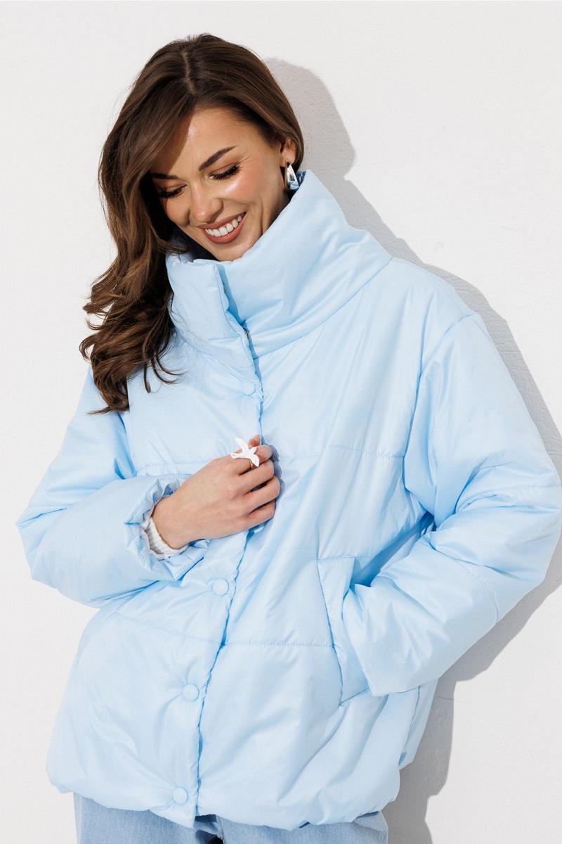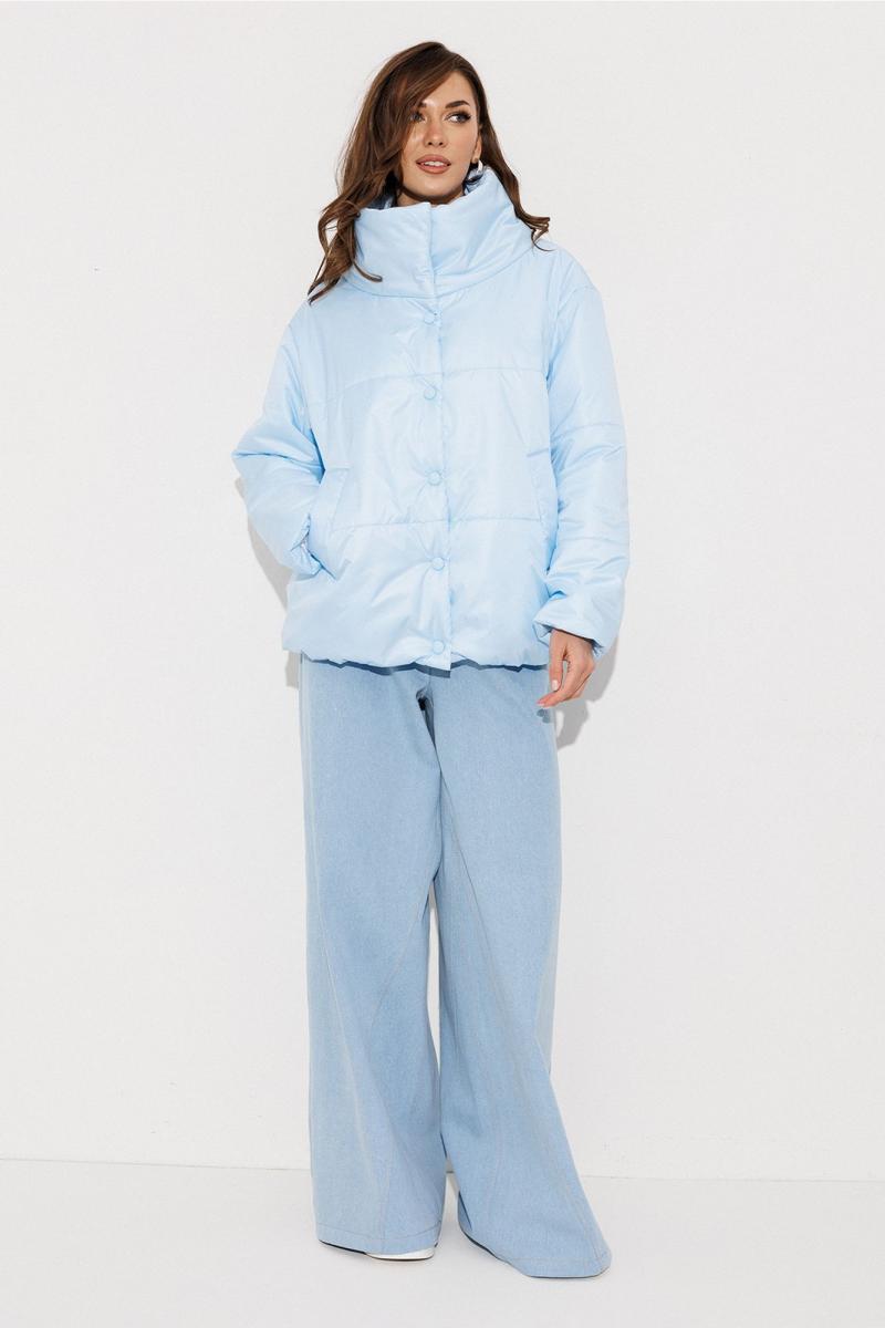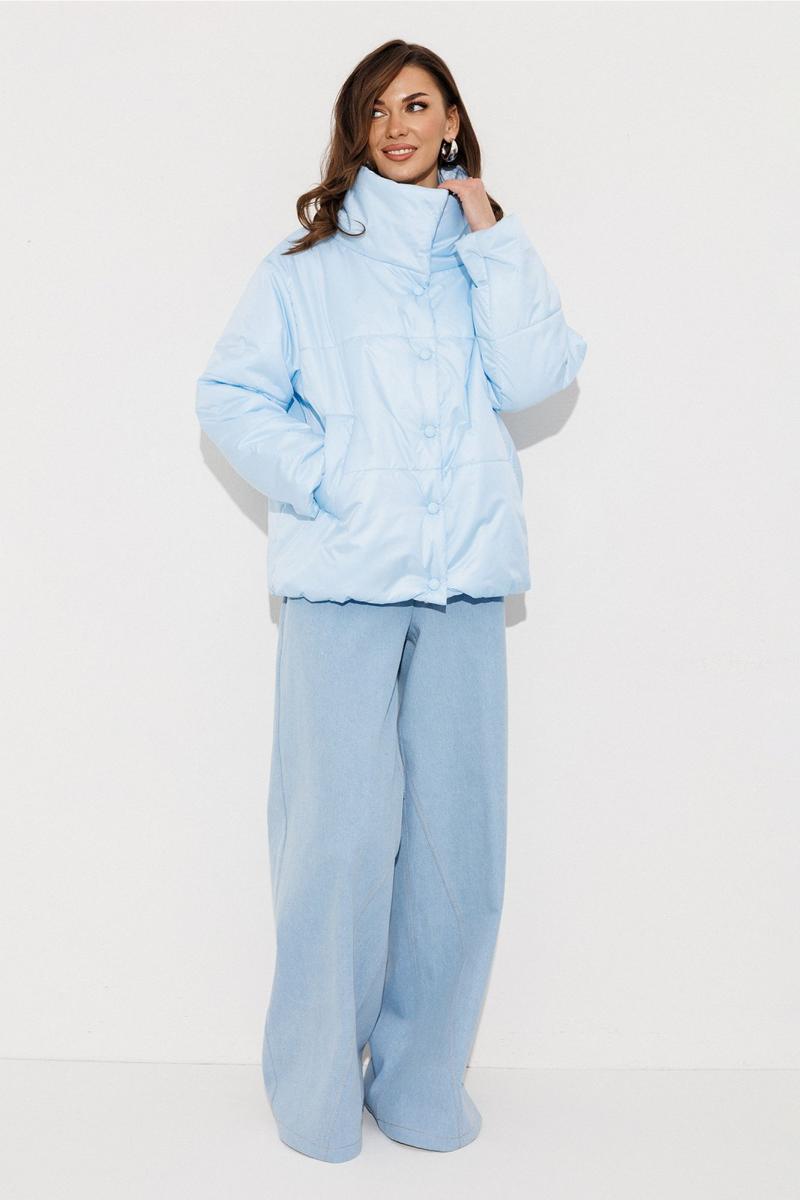 Куртка демисезонная (t до -5С) прямого силуэта с втачным рукавом внизу на резинке и со спущенной линией плеча. Полочка с центральной застёжкой на кнопки и карманы-листочки. По спинке нашивка. Воротник-стойка с застежкой на пришивные кнопки. Полочка и спинка по низу на резинке. Куртка из плащевой ткани со стежкой на синтепоне (isosoft 150г/м²) и подкладке.