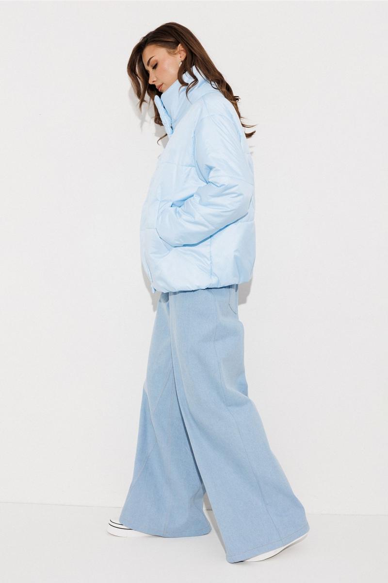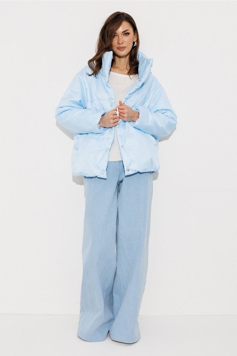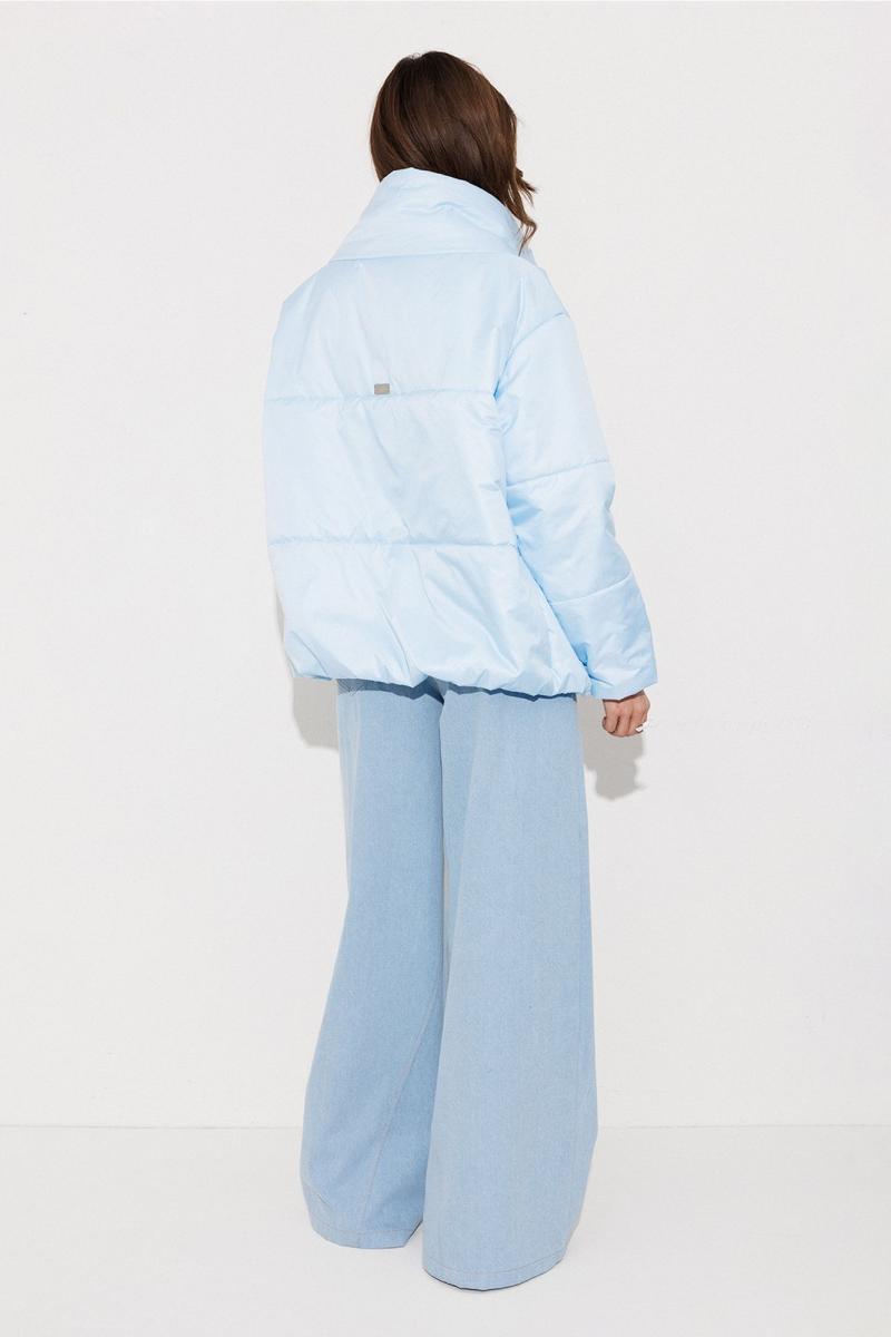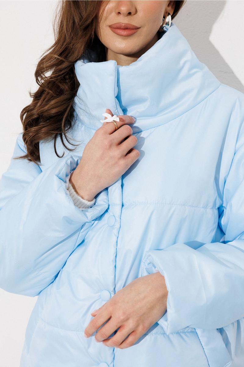 Куртка демисезонная (t до -5С) прямого силуэта с втачным рукавом внизу на резинке и со спущенной линией плеча. Полочка с центральной застёжкой на кнопки и карманы-листочки. По спинке нашивка. Воротник-стойка с застежкой на пришивные кнопки. Полочка и спинка по низу на резинке. Куртка из плащевой ткани со стежкой на синтепоне (isosoft 150г/м²) и подкладке.
