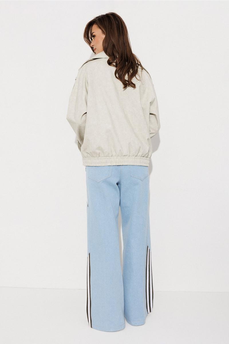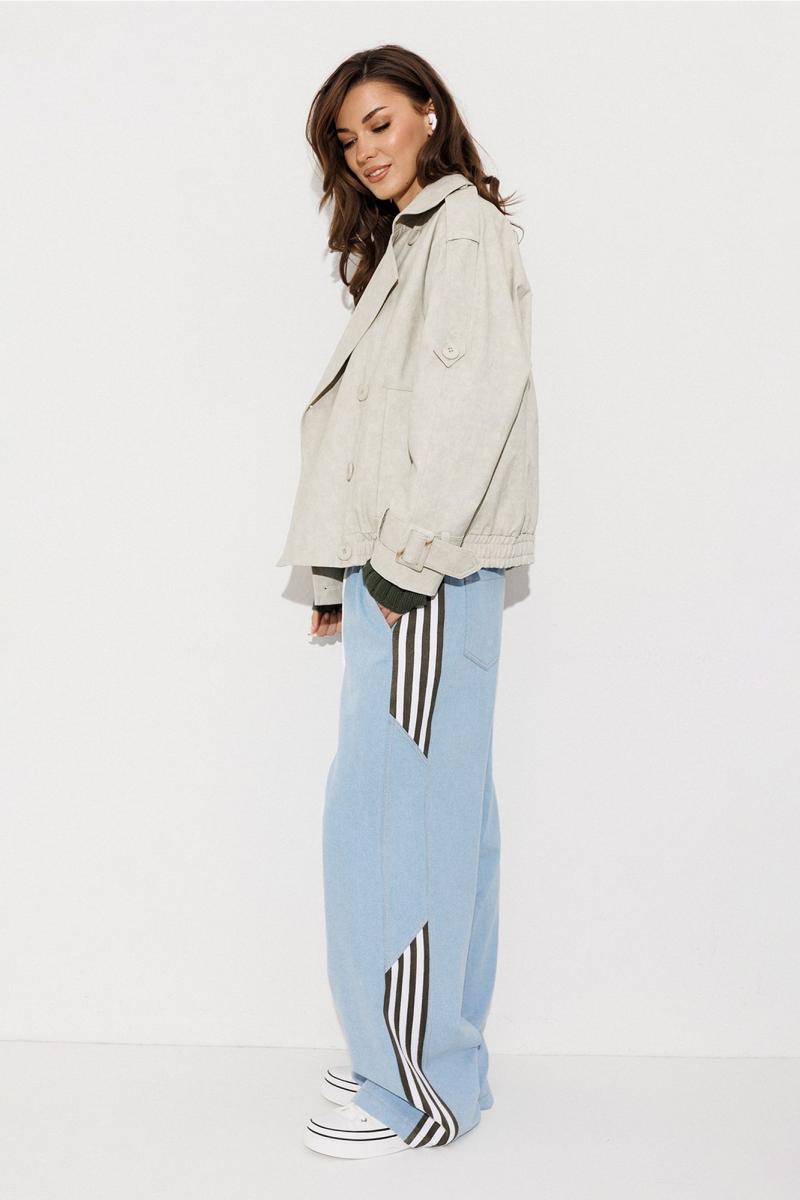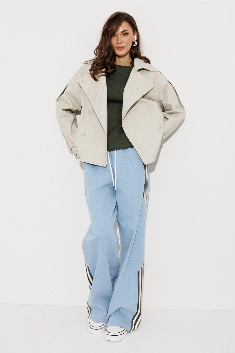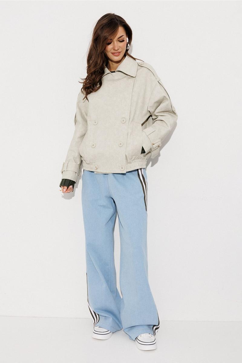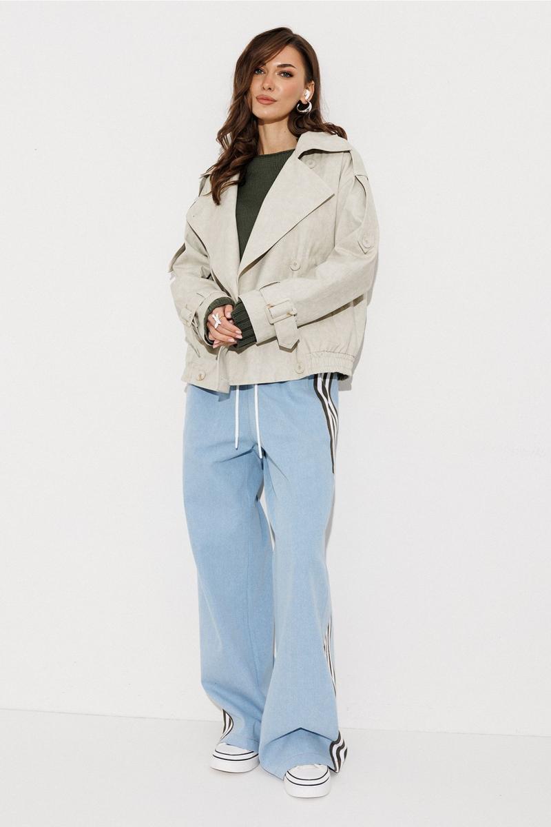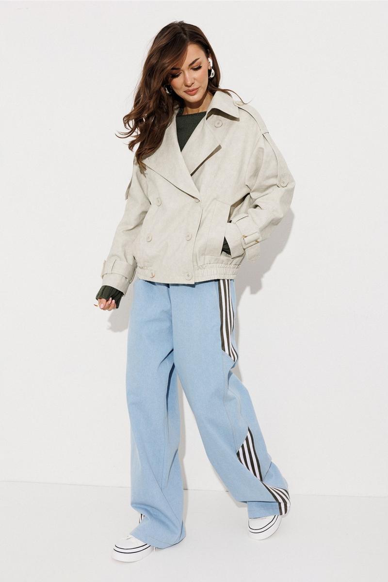 Куртка-тренчкот прямого силуэта с двубортной застежкой на петли-пуговицы, двухшовным рукавом и спущенной линией плеча, по низу рукавов паты с пряжкой. По полочке рукав втачной по спинке-реглан. Воротник пиджачного типа - отложной с лацканом. Полочка с карманом-листочкой. Спинка со средним швом и рельефом. По плечевому шву погон с застежкой на петли-пуговицы с щлеками. По низу притачная отстроченная планка со вставленной в нее резинкой. Куртка на подкладке.