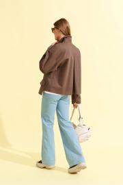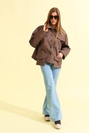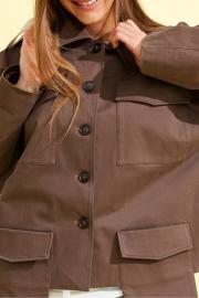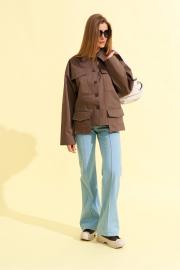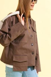 Куртка женская из хлопковой костюмной ткани прямого силуэта, со спущенным плечом, длиной до линии бедер, с центральной бортовой застежкой на петли и пуговицы, на подкладке. Полочки с 2мя накладными верхним и нижним карманами с клапанами. Спинка со средним швом и встречной складкой в шве,застроченной сверху до уровня лопаток. Рукав втачной двухшовный. Воротник отложной с отрезной стойкой.