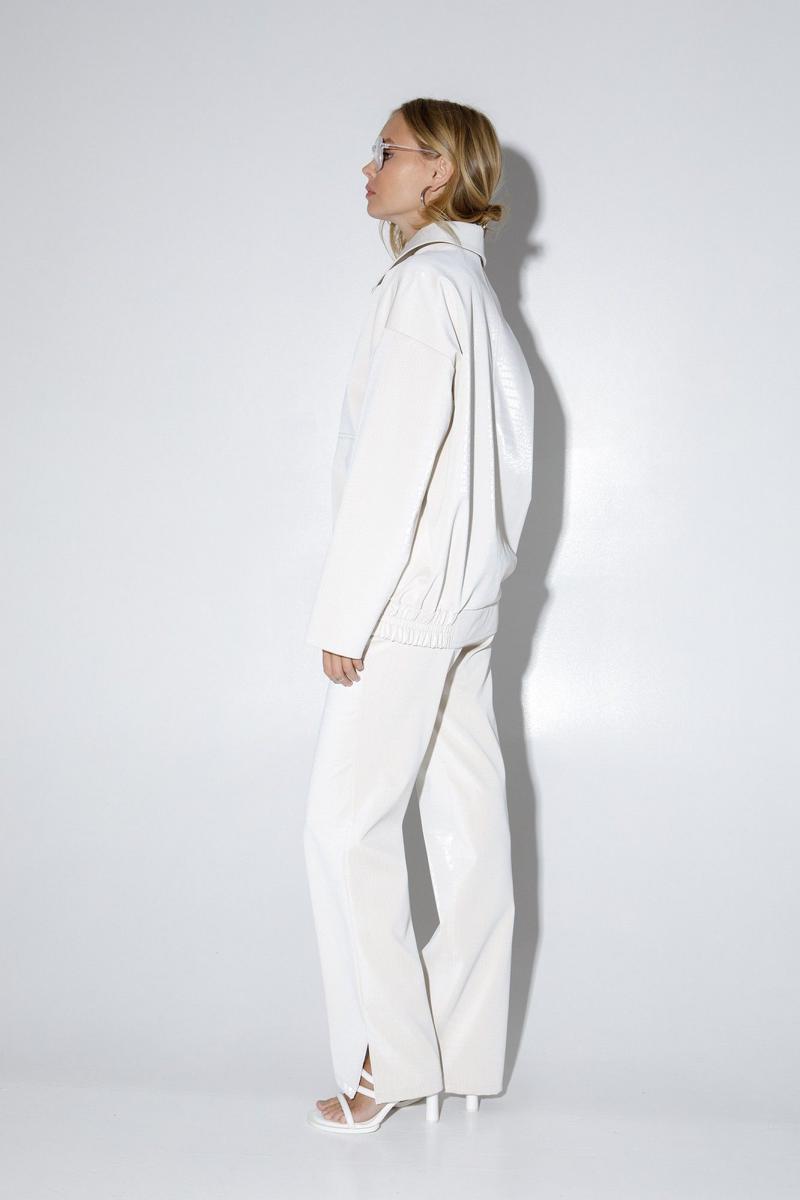 Куртка-бомбер из фактурной экокожи кожи с анималистичным рисунком. Детали: прямой силуэт, воротник-стойка, пояс переда и спинки на резинке, застежка на потайные металлические кнопки, рукава длинные с высокими обтачками по низу, которые при необходимости можно подвернуть; большие накладные карманы по переду, спинка со средним швом, куртка на подкладке. Длина по спинке с поясом около 64 см в размерах 40-46 и около 66,5 см в размерах 48-52, длина рукава+ плечо около 50,5+12,5 см