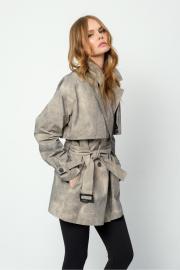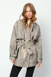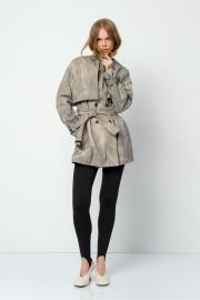 Хлопковый свободный тренчкот с винтажным эффектом потертости. Детали: прямой силуэт, спущенная линия плеча, пиджачный воротник, отлетные кокетки, застежка на петли и пуговицы, рукава длинные, карманы в боковых швах, съемный пояс. Тренч на подкладке. Длина по спинке около 78 см в размерах 40-46 и около 81 см в размерах 48-52. Длина рукава+ спущенное плечо около 55 см+7 см= 62 см