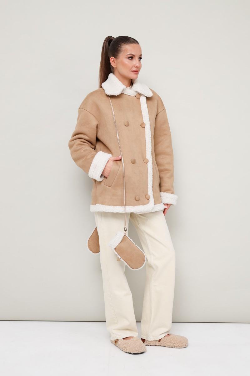 Женская дубленка прямого силуэта, длиной до середины бедра. Воротник и лацканы отложные. Застёжка двубортная на петли и обтяжные пуговицы. Спереди обработаны функциональные карманы с листочкой. Спущенная линия втачивая плеча, длинные двухшовные рукава с отворотом. Спинка с отрезной кокеткой. Дубленка декорирована искусственным мехом, который придает образу благородную мягкость и уют.Рукавицы из искусственного меха с отложными манжетами. Стильный и акцентный аксессуар, который гармонично дополнит образ с дубленкой. В комплекте шнур с креплением на карабин.