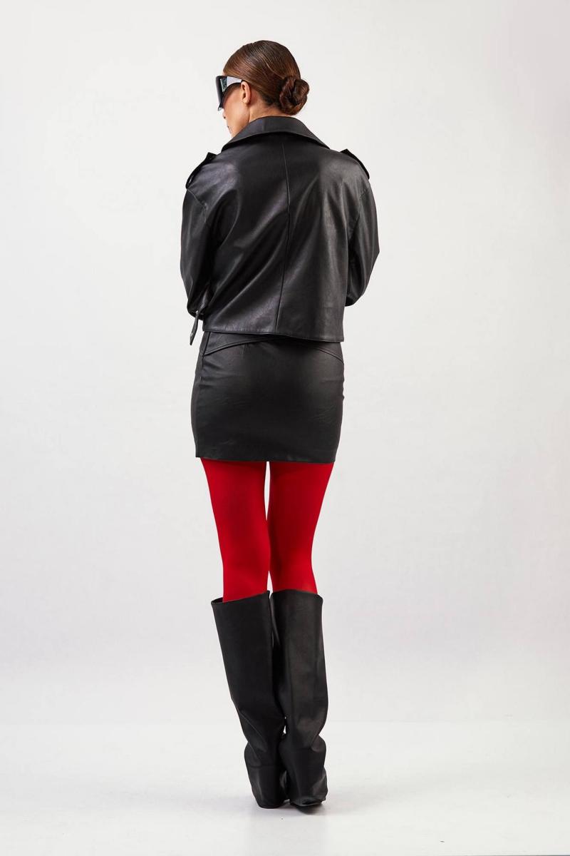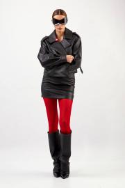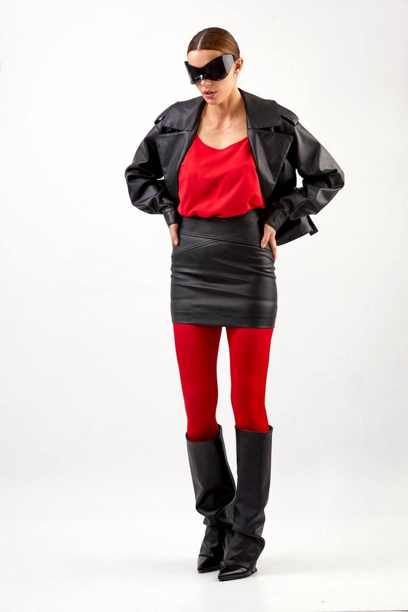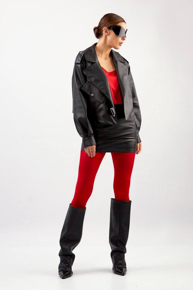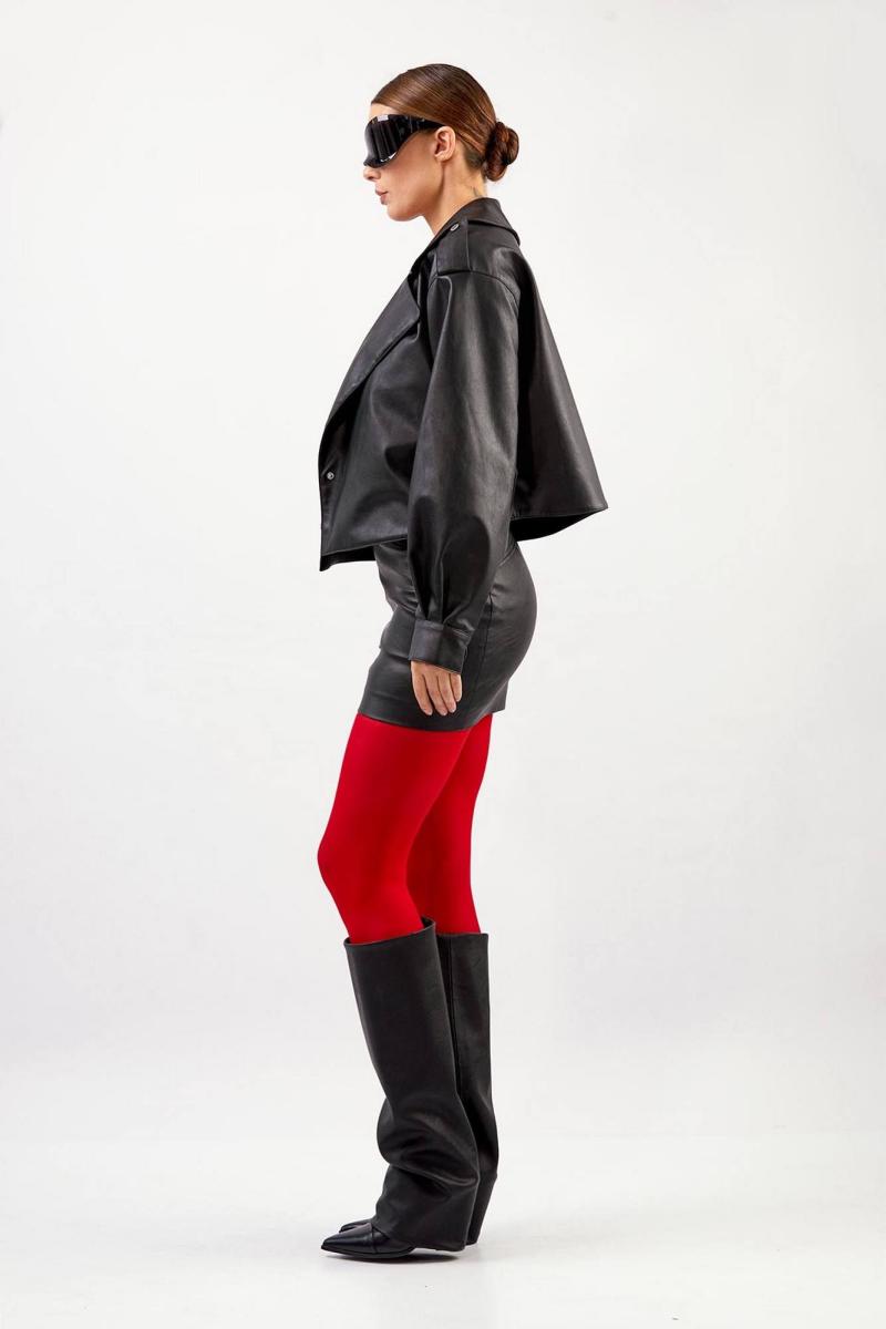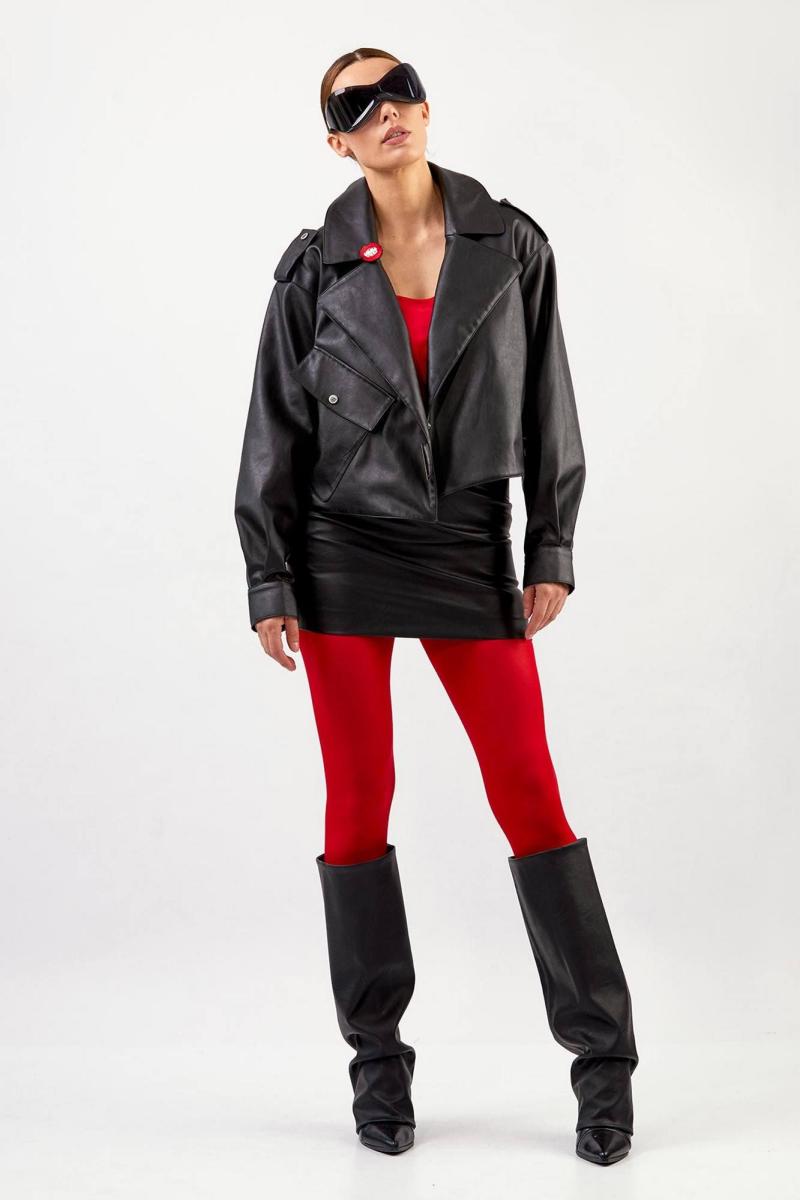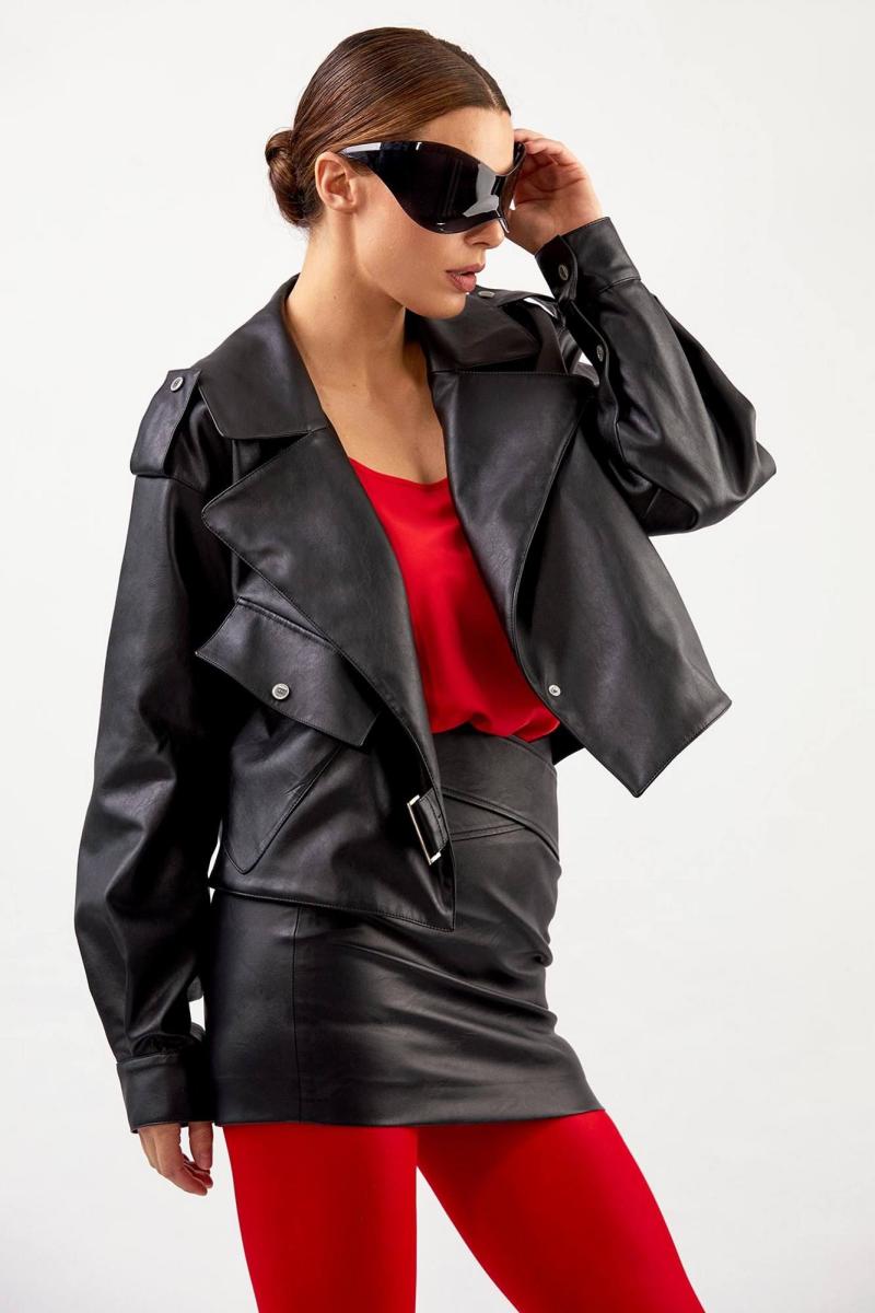 Куртка из эко-кожи: - прямой силуэт - длина чуть ниже талии - воротник пиджачного типа - спущенная линия плеча - погоны с кнопкой - застёжка смещённая на кнопку и пату с кнопками - на правой части переда наклонный карман с клапаном и кнопкой - два внутренних кармана - по спинке средний шов - на подкладке