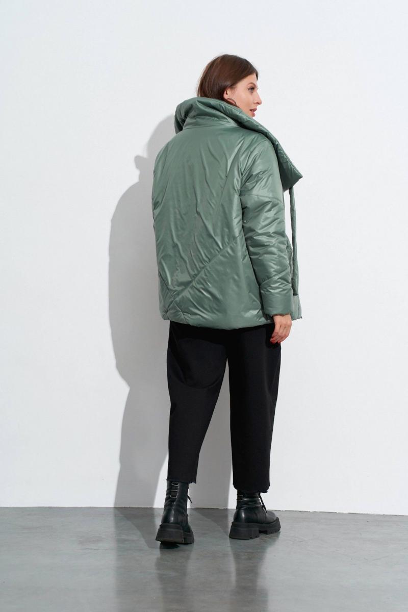 Куртка на утеплителе с ассиметрично расположенной застёжкой. На деталях переда обработаны: накладной карман справа и карман в рельефе слева. Застёжка из открыто настроченной молнии. Объёмный воротник-стойка подвязывается слева у плеча . Рукава одношовные, с декоративными строчками. Изделие на подкладке. Длина по спинке ок. 74 см. в 52м.