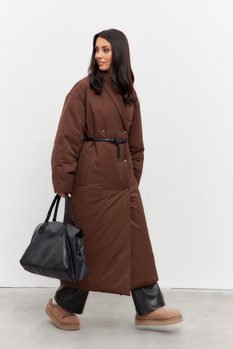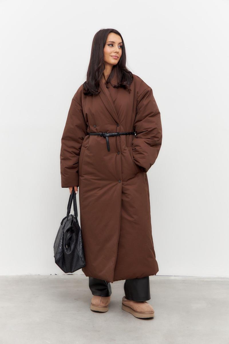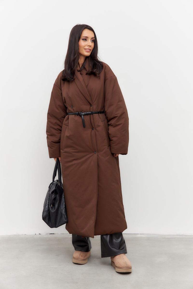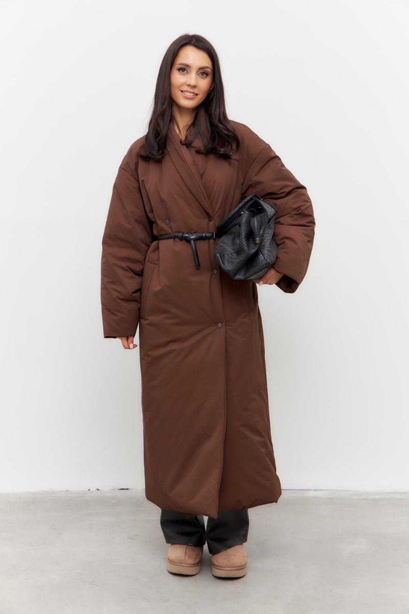 Пальто в коричневом цвете. Пальто двубортное, с застежкой на кнопки. Рукав спущенный. Пальто на синтепоне. В комплекте съемный пояс.