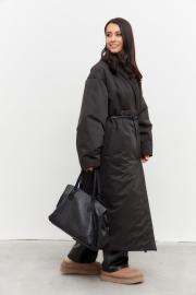 Пальто в черном цвете. Пальто двубортное, с застежкой на кнопки. Рукав спущенный. Пальто на синтепоне. В комплекте съемный пояс.
