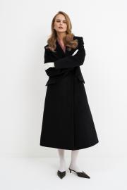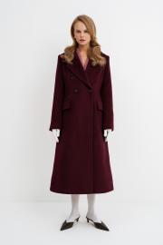 Двубортное приталенное пальто X- силуэта. Детали: полуприлегающий силуэт, перед с прорезными карманами с клапанами, перед и спинка с талиевыми вытачками, спинка со средним швом и шлицей, застежка на петли и декоративные пуговицы, втачные длинные рукава, пальто на подкладке Длина по спинке около 114 см, длина рукава около 61 см