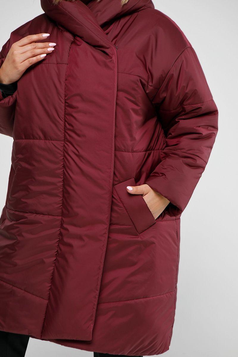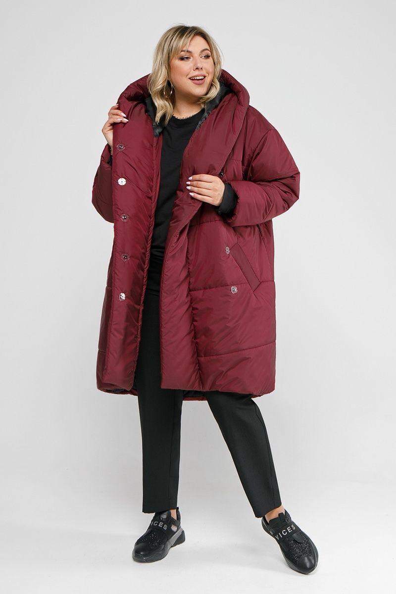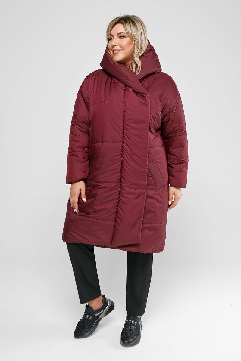Женское дутое пальто овального силуэта, выполненное из плотной плащевой ткани с утеплителем – синтепон 200. Застежка смещенная, на пришивные кнопки. По краю борта есть широкая планка, которая переходит на капюшон. По переду есть карманы с листочками, вход которых расположен под наклоном. Изделие на утепленной подкладке. Линия низа спинки длиннее линии низа переда. Длина рукава 61 см. Длина пальто по спинке от шва втачивания капюшона в горловину 105 см.