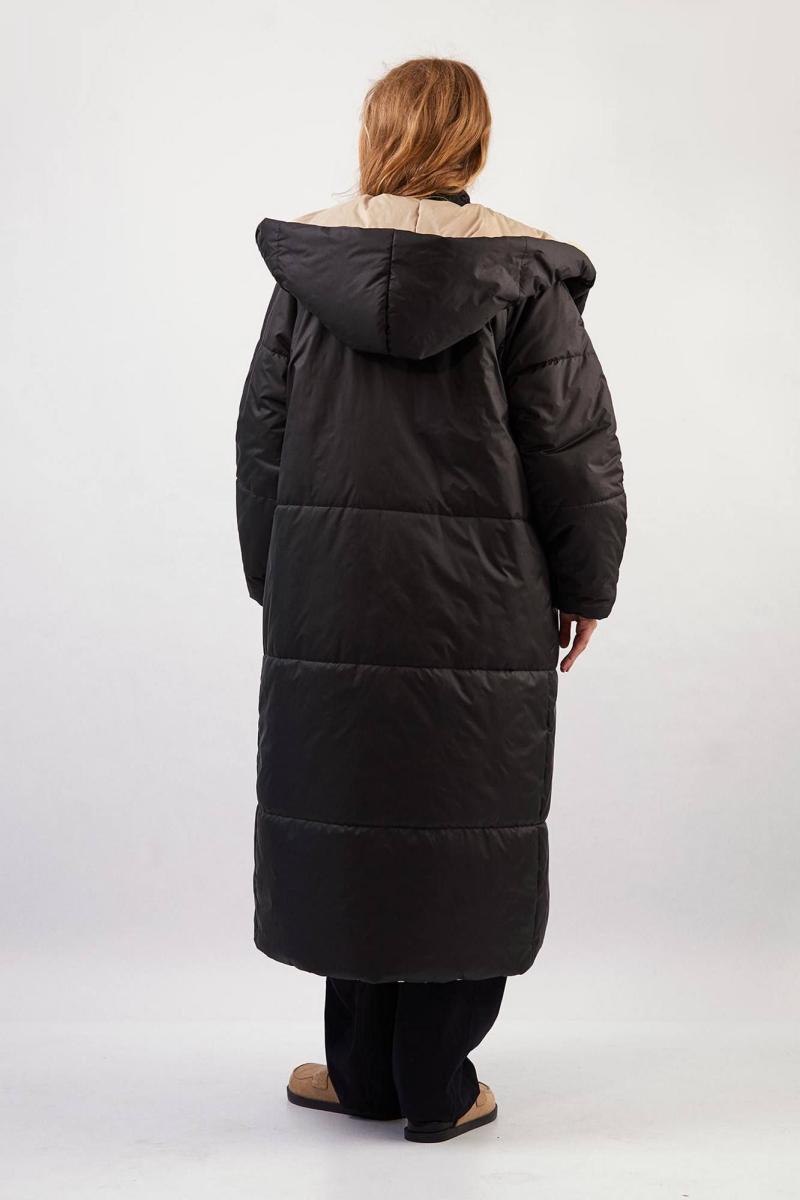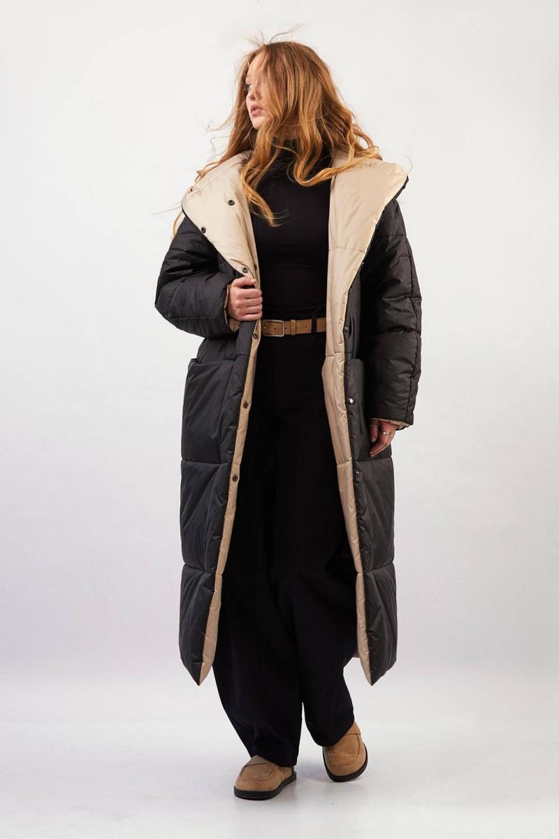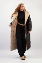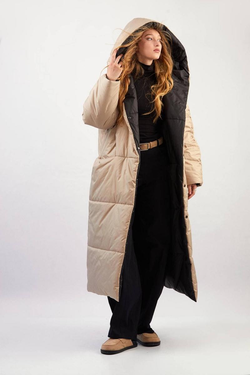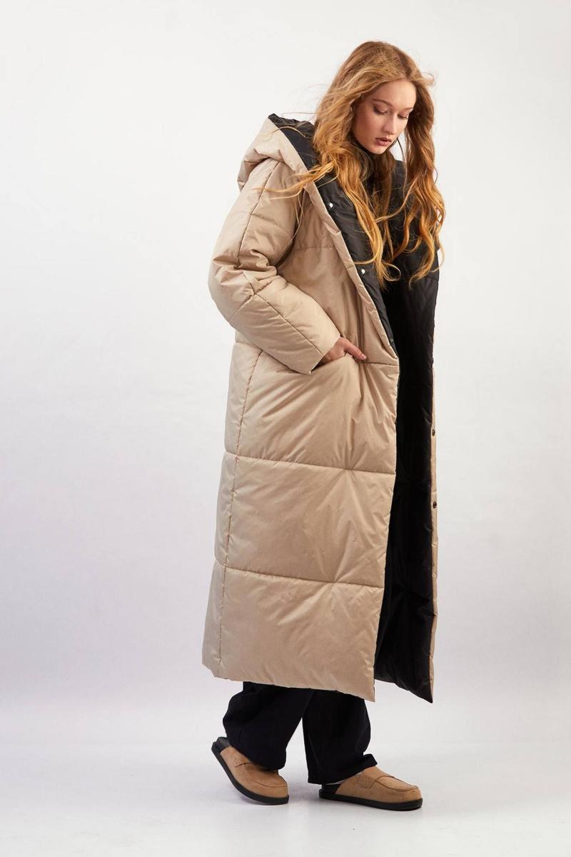 Пальто двухстороннее с капюшоном - прямой силуэт - застёжка на два ряда потайных кнопок - передние карманы в горизонтальном шве - рукава-реглан, двухшовные, зауженные к низу - стёганые перед, спинка, рукава и капюшон - утеплитель 300 г/м² - температурный режим до –30 °C