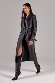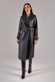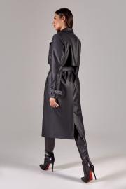 Тренч свободного силуэта на подкладке. Выполнен из эко-кожи. По переду прорезные карманы и отлетные кокетки. Воротник пиджачного типа. На рукавах функциональные паты. По спинке отлетная кокетка. В боковых швах шлевки для съемного пояса.