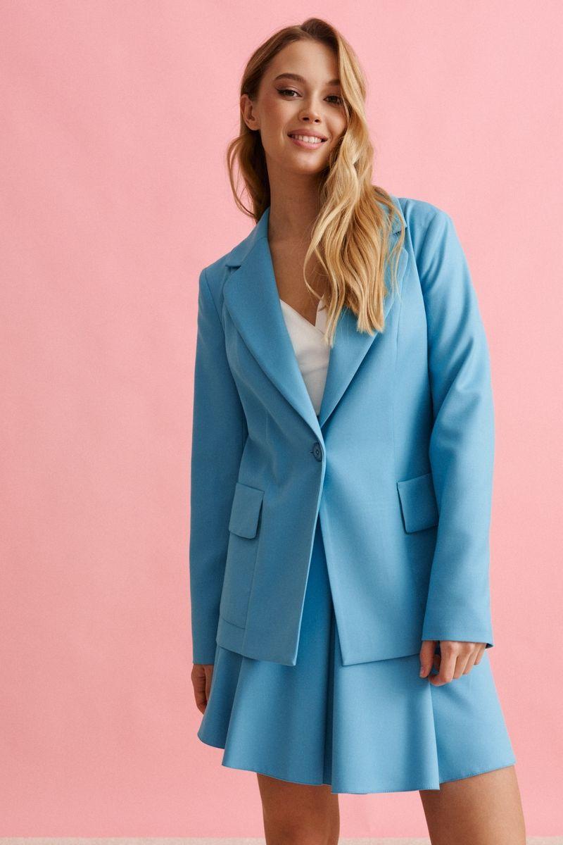 Жакет прилегающего силуэта выполнен из полотна цвета небо. Характеристики: прилегающий силуэт, подкладка, застежка центральная на петлю пуговичку, воротник с плавным лацканом, по переду карманы с клапаном, рукав втачной. Длина изделия 66, длина рукава 64 см.