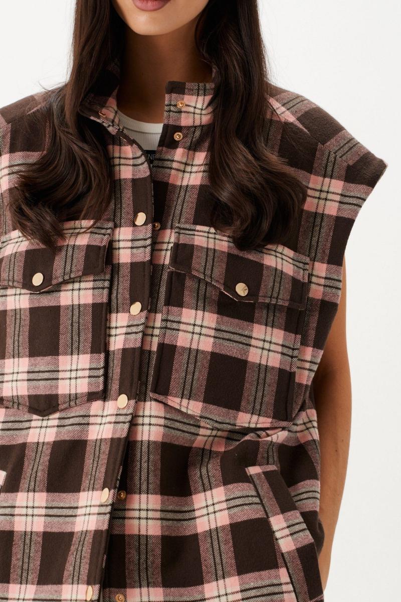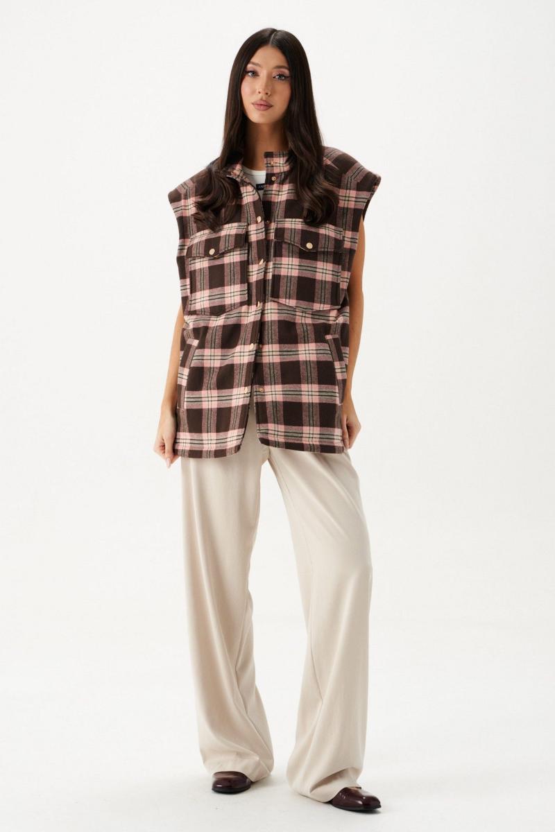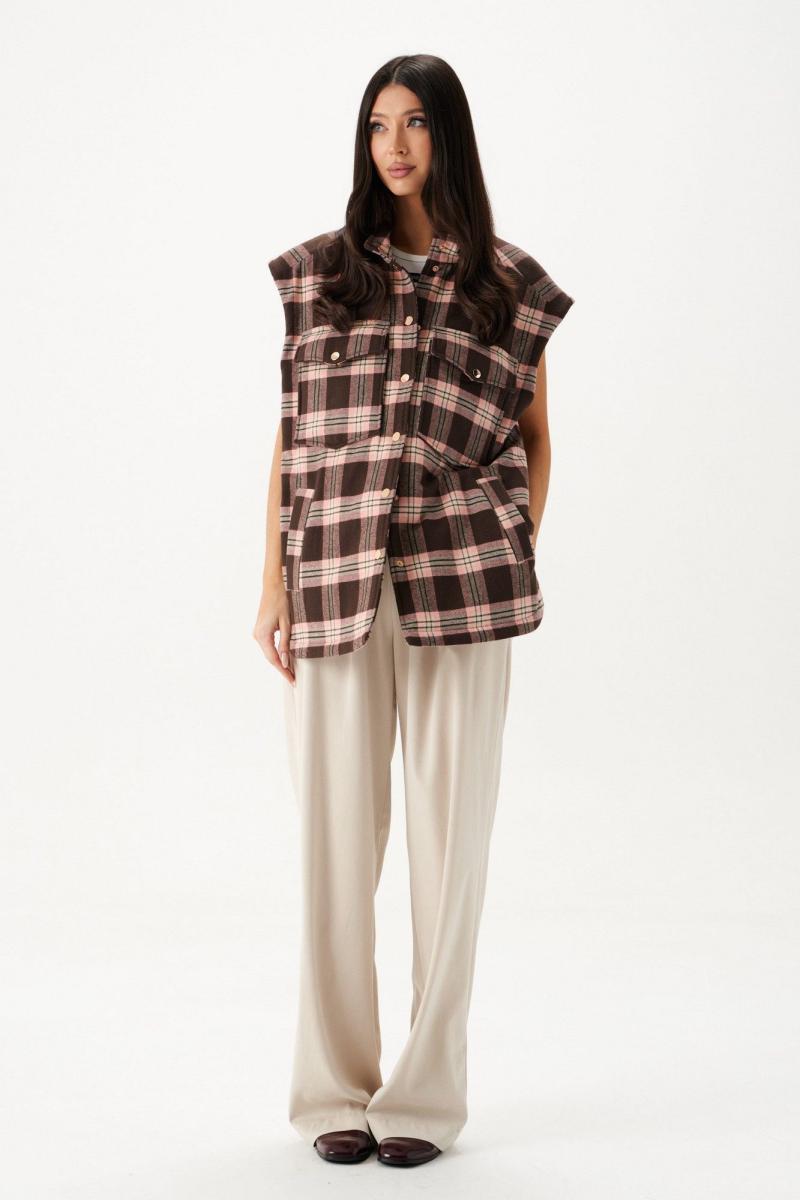 Жилет свободного кроя. Выполнен из хлопкового полотна. Воротник стойка. На уровне линии груди накладные карманы с клапаном, внизу прорезные карманы с листочкой. Линия плеча расширенная. Спинка цельнокроенная, переходящая в кокетку. Застёжка центральная - кнопки. Изделие с подкладкой с синтепоном. По низу внутри потайные карманы. Длина спинки 72 см