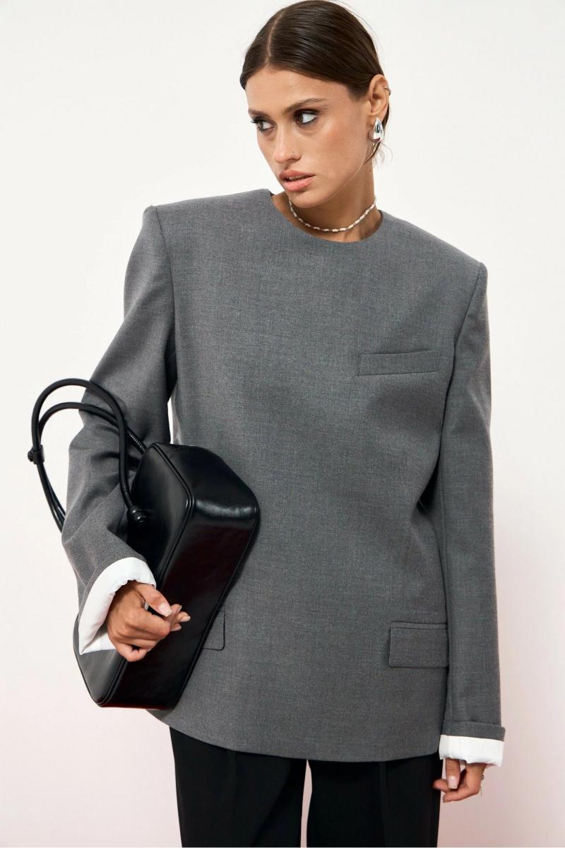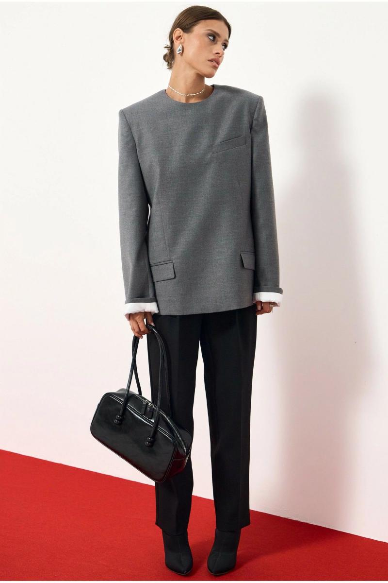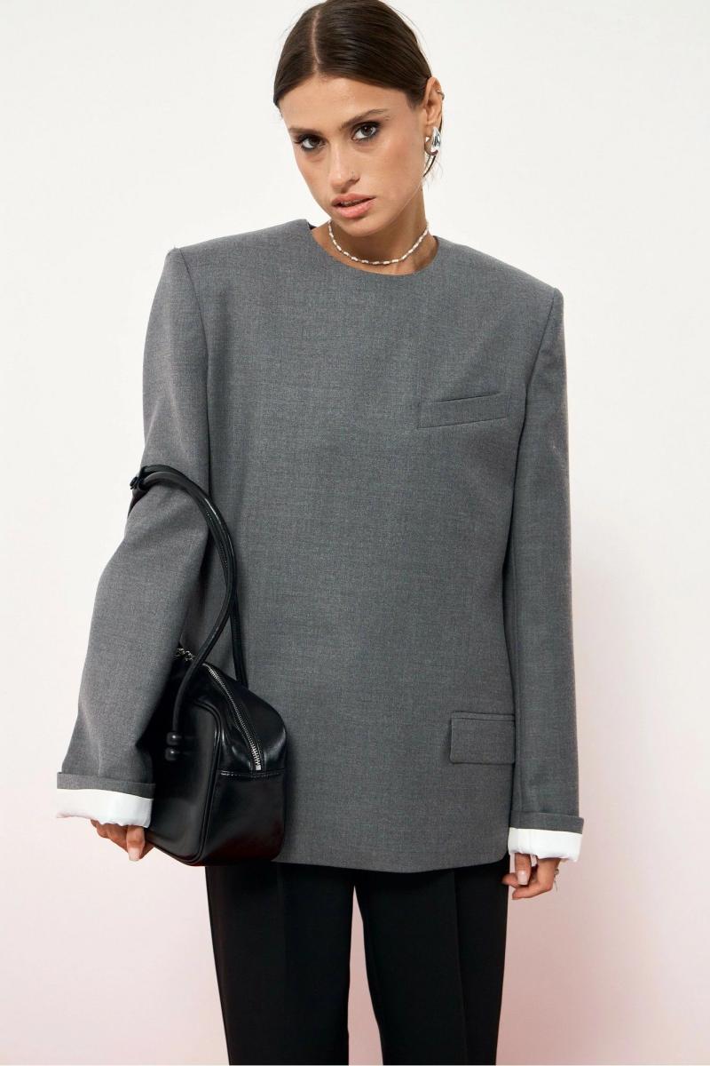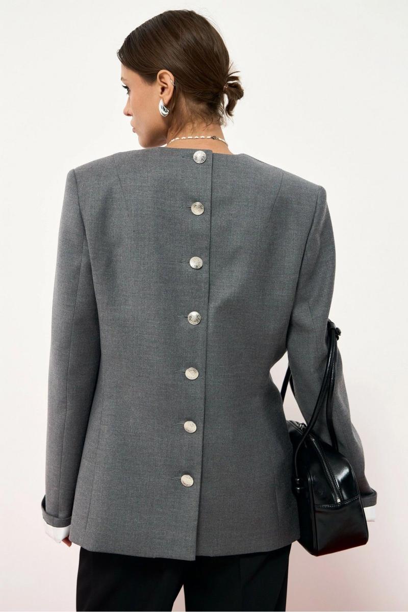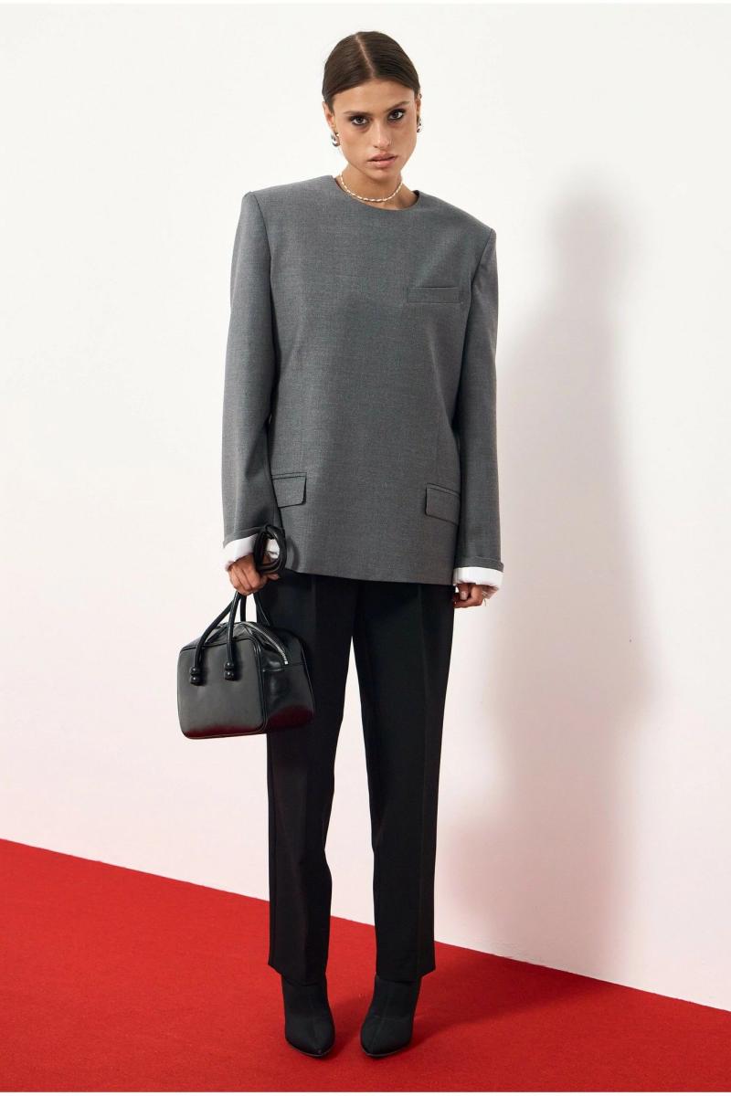 Жакет прямого свободного кроя. По переду бокавые клапаны. По спинке функциональная застежка на декоративные пуговицы. Рукав втачной, линия плеча слегка увеличена, есть подплечники. По низу рукава белая подкладка, которую можно использовать, как манжет. Жакет на подкладке. Длина жакета по спинке: 68 см