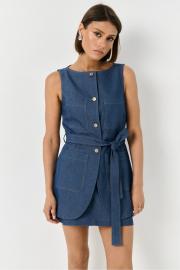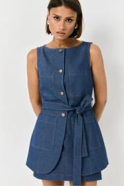 Жилет из плотной хлопковой джинсовой ткани. Жилет полуприлегающего силуэта, на подкладке. По переду застежка на пуговицы. По переду накладные карманы и пояс из основной ткани изделия.