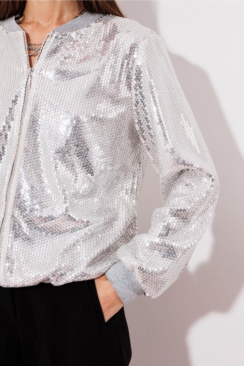 Жакет из трикотажного полотна с пайетками. Прямого силуэта, внизу на манжете из довяза. С центральной застежкой на разьемную декоративную молнию с отделочным слайдером, под молнию пришита декоративная атласная планка. Горловина округлая с довязом. Рукав втачной одношовный, внизу с довязом. Жакет на атласной подкладке в тон.