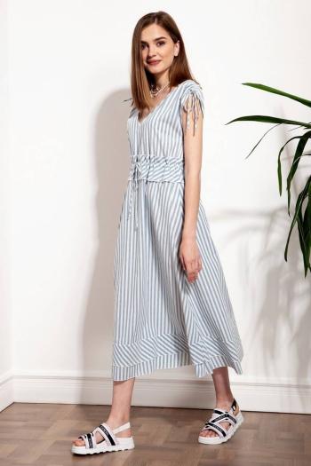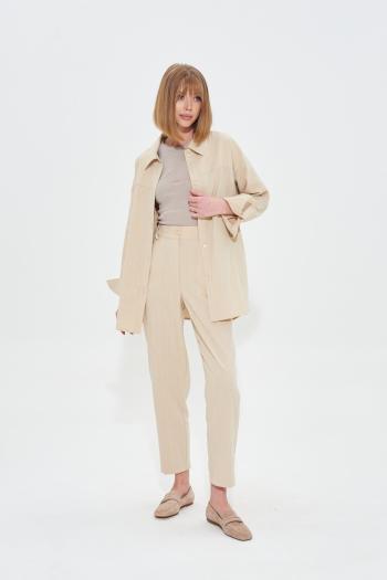 Жилет льняной полуприлегающего силуэта без рукавов. Полочка с центральной застежкой на завязки и крючок, с 2-мя вертикальными вытачками от низа для лучшего прилегания изделия. Спинка с вертикальной вытачкой от низа и центральным швом. Жилет на подкладке из хлопка.