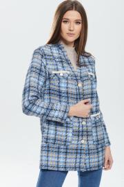 Жакет женский прямого силуэта , выполненный из ткани "Шанель" высокого качества . Жакет с центральной застежкой , рукав втачной , линия плеча спущена . По переду жакета также функциональные накладные карманы и отделочные паты. В качестведекора отделочная тесьма по краю карманов и акцентные пуговицы.