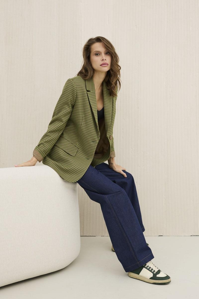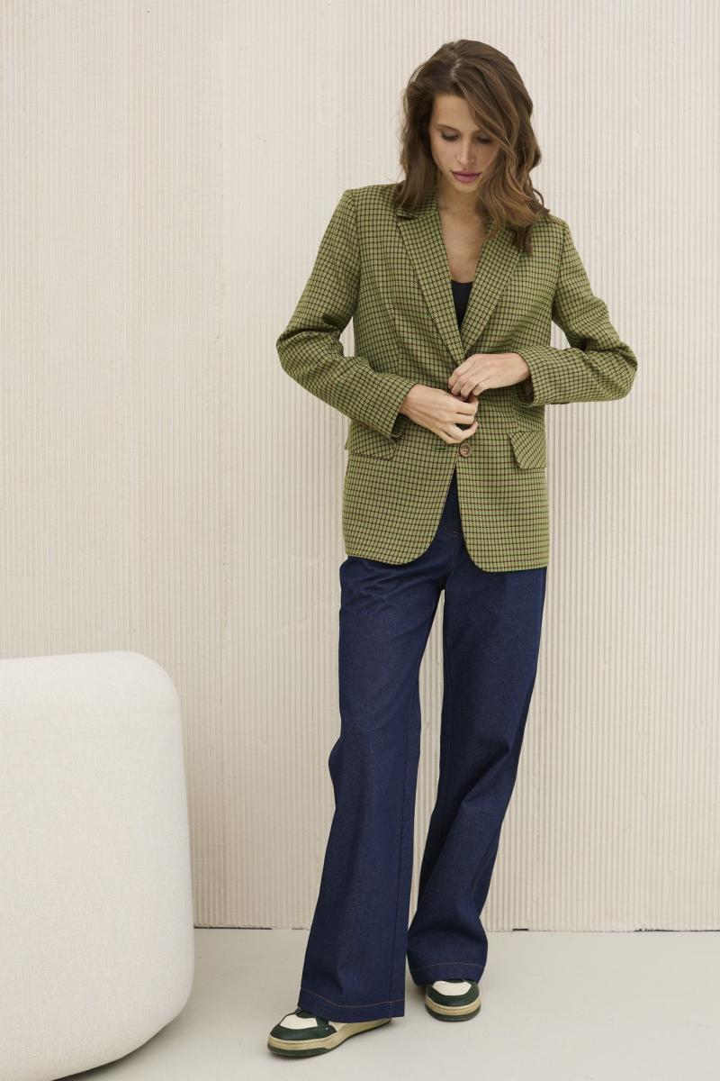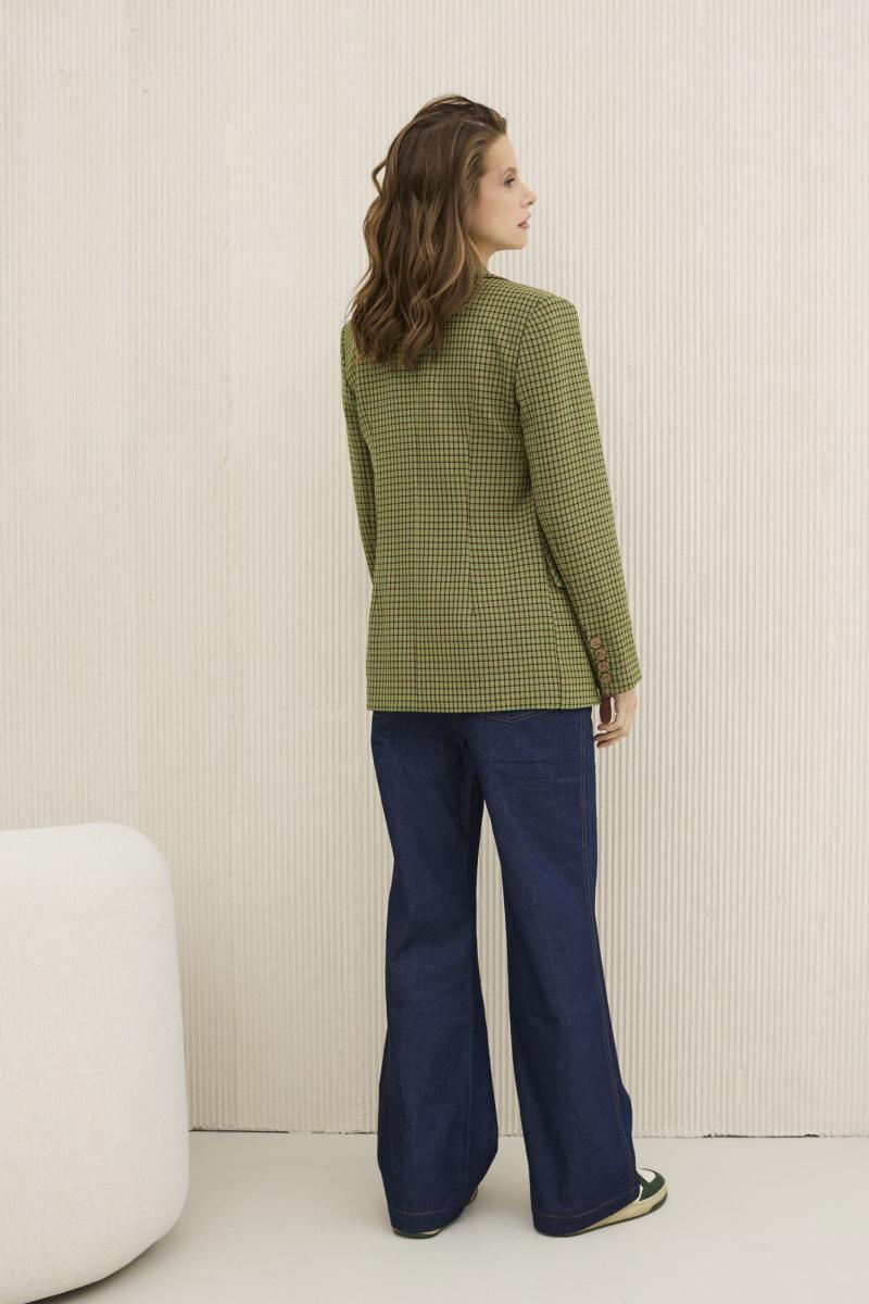 Жакет женский полуприлегающего силуэта , выполненный из костюмной ткани высокого качества . Жакет с центральной застежкой , рукав втачной двухшовный , внизу рукава шлица. Воротник стояче - отложной с отворотами лацканов . По переду жакета также функциональные карманы с клапанами . Жакет на подкладке.
