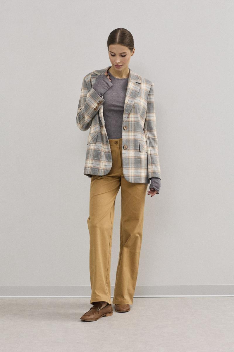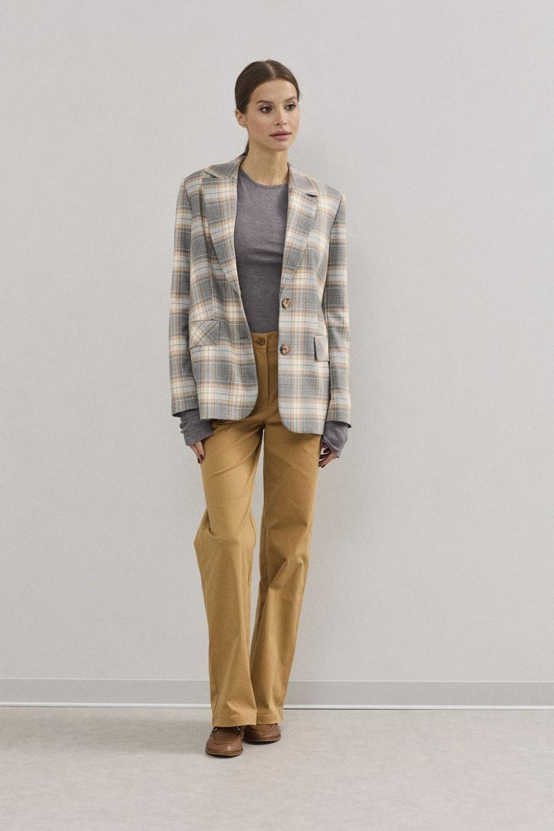 Жакет женский полуприлегающего силуэта , выполненный из костюмной ткани высокого качества . Жакет с центральной застежкой , рукав втачной двухшовный , внизу рукава шлица. Воротник стояче - отложной с отворотами лацканов . По переду жакета также функциональные карманы с клапанами . Жакет на подкладке.