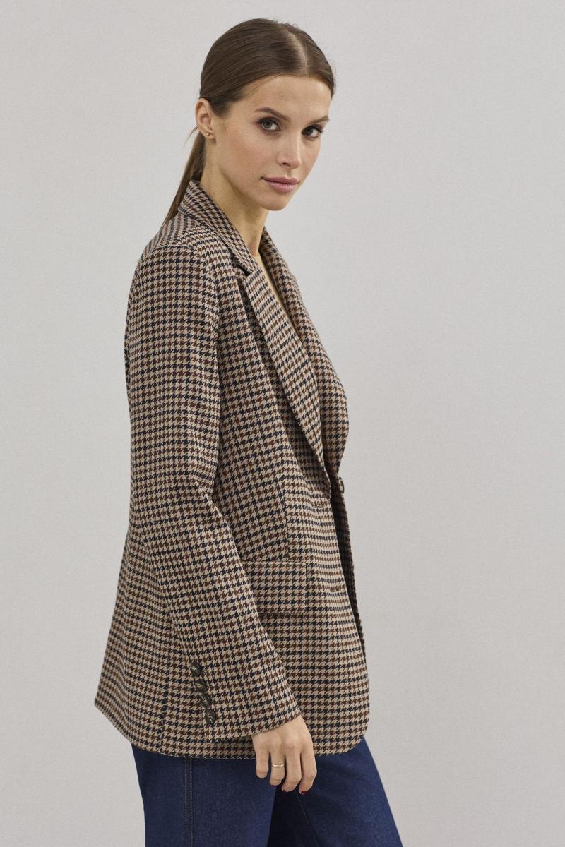 Жакет женский полуприлегающего силуэта , выполненный из костюмной ткани высокого качества . Жакет с центральной застежкой , рукав втачной двухшовный , внизу рукава шлица. Воротник стояче - отложной с отворотами лацканов . По переду жакета также функциональные карманы с клапанами . Жакет на подкладке.