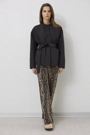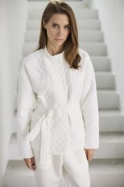 Жакет женский утепленный , полуприлегающего силуэта , выполненный из фактурной двухслойной ткани . Жакет с центральной застежкой на пришивных кнопках . Рукав спущенный одношовный. Воротник в виде невысокой стойки . По переду жакета подкладка , а также функциональные карманы. В комплекте также пояс из основной ткани .
