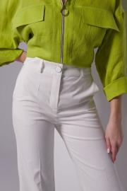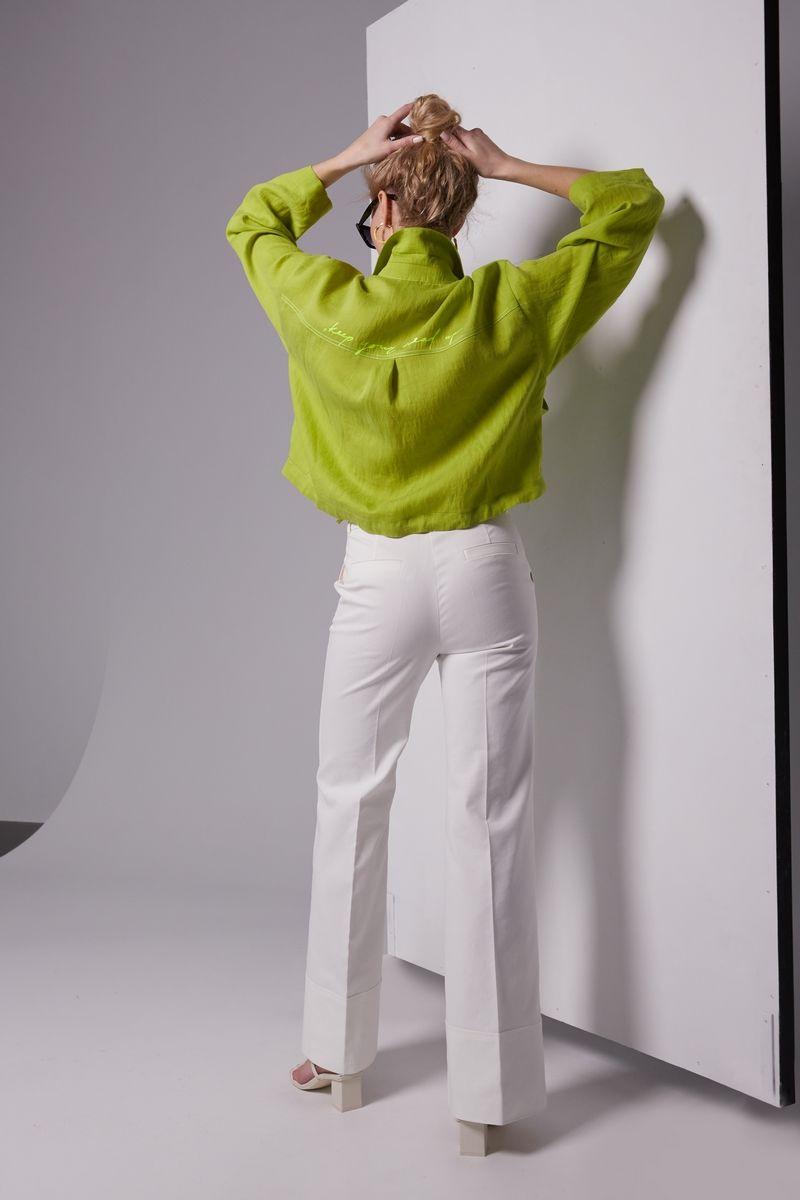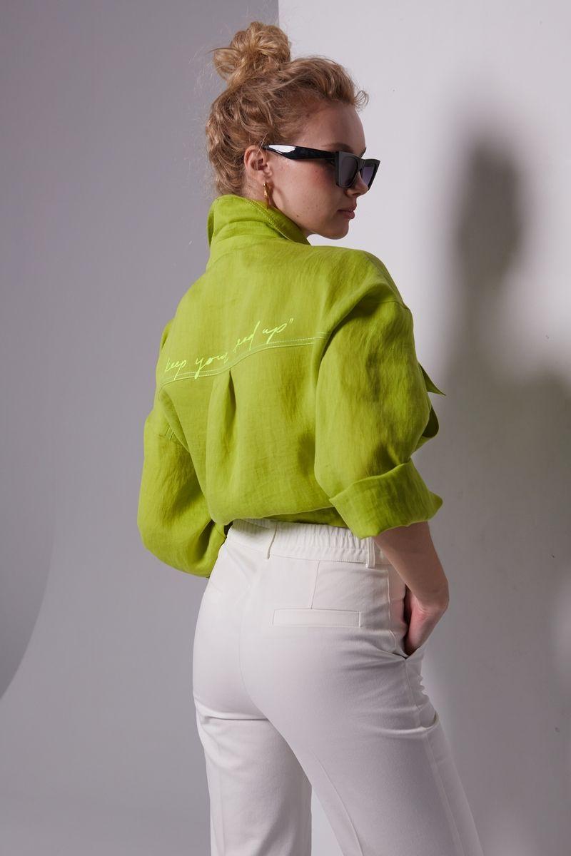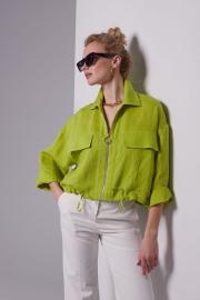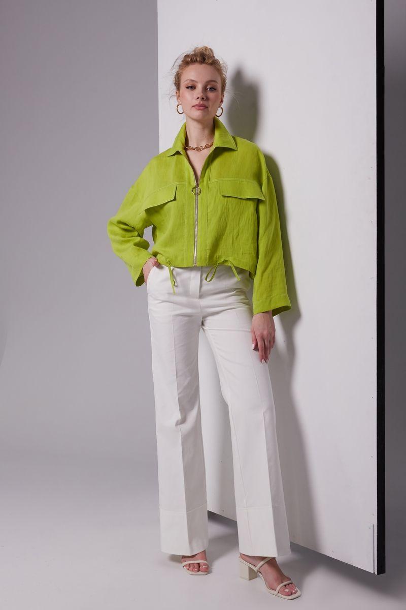 Жакет из платьево-блузочной ткани, прямого силуэта, свободного кроя «оверсайз» длиной чуть ниже талии, с отложным воротником на круглой горловине, со спущенной линией плеча, с втачными рукавами длиной до запястья. Детали переда с клапанами в шве притачивания кокеток, с карманами, наклонными к боковым швам, с притачными планками по борту и застёжкой на металлическую тесьму-молнию. Спинка с бантовой складкой по шву притачивания кокетки. По низу жакета отстрочена кулиса и втянут шнурок из основной ткани. Планки застрочены отделочной строчкой, по клапанам, кокеткам и воротнику прострочены двойные отделочные строчки. На кокетку спинки нанесена художественная печать.