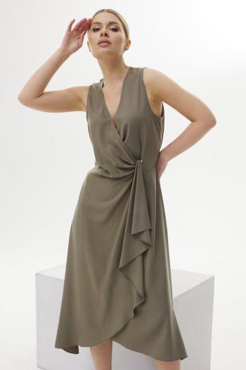 Жакет из костюмной ткани «рогожка» укороченный, длиной чуть ниже талии, прямого силуэта, с втачными двухшовными рукавами длиной выше локтя, горловина округлой формы, без воротника. Детали переда с нагрудными вытачками из боковых швов, с настрочными карманами, расположенными на уровне линии груди и линии талии. Спинка со средним швом. Карманы со скруглёнными нижними углами и бахромой. Застёжка жакета однобортная центральная на петли и пуговицы. По центру верхнего края карманов пришиты пуговицы. Жакет на подкладке.