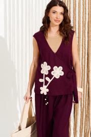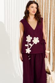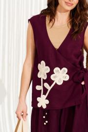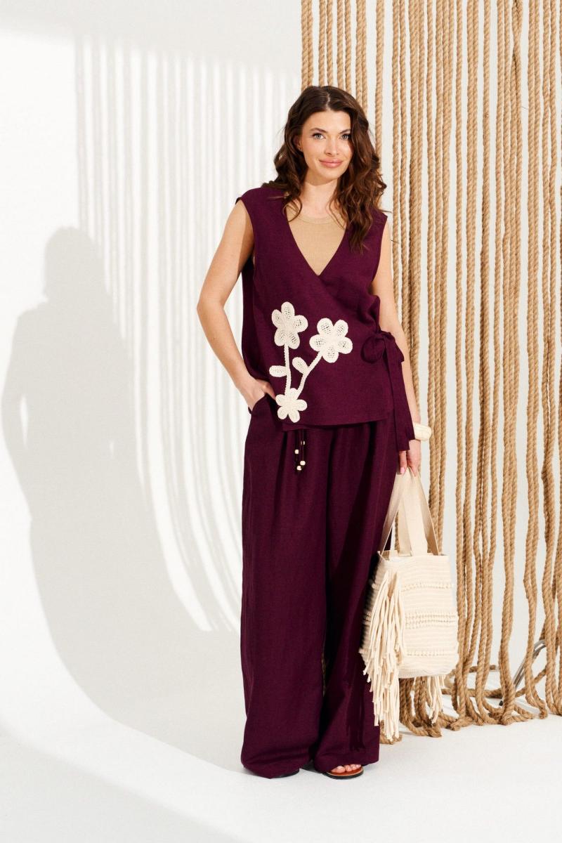Жилет свободного объема, прямого силуэта, с запахом на завязках и V-образным вырезом горловины. Детали переда с талиевыми вытачками. На правой детали переда расположены декоративные нашивки «Цветы». Спинка со средним швом. Горловина и борта обработаны цельнокроеными обтачками. Длина изделия на модели вдоль середины спинки — 59 см (допустимое отклонение +/- 1 см)