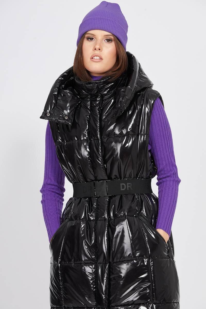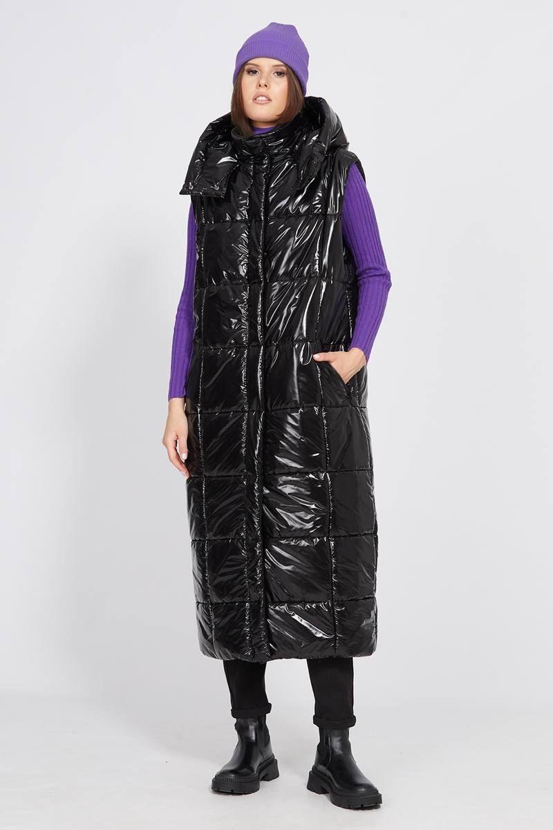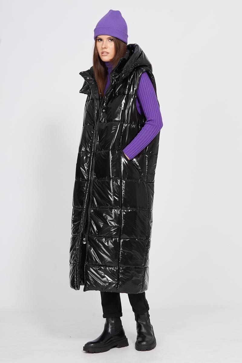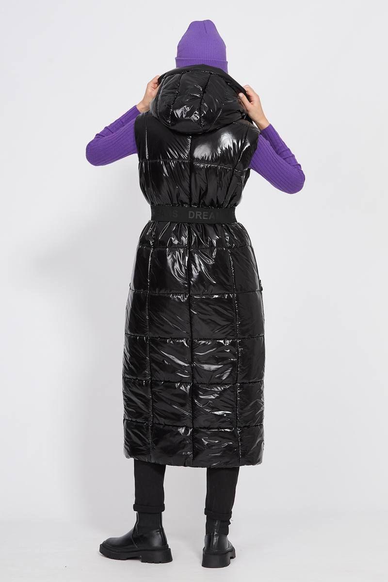 Жилет выполнен из глянцевой плащевой ткани, простеганной с изософтом. Жилет прямого силуэта, длиной миди. Спереди застежка на молнию и кнопки на планке. Карманы прорезные, застегивающиеся на молнию. Спинка со средним швом. Воротник-стойка. Капюшон съемный, крепится на пуговицы. В комплект входит съемный ремень из широкой эластичной тесьмы с пряжкой-карабином. Жилет на притачной по низу подкладке.