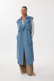 Жилет удлиненный прямого силуэта с центральной двубортной застежкой на петли и пуговицы. По переду обработаны нагрудные вытачки, карманы с наклонным входом с листочкой. Спинка со средним швом, в котором обработана шлица. По спинке и переду выполнены отлетные кокетки с отделочными строчками контрастного цвета. В области талии расположены широкие шлевки для пояса из основной ткани, которым комплектуется жилет. По горловине воротник с отрезной стойкой. В области плечевых швов расположены декоративные паты с пуговицами. Все отделочные строчки выполнены гарусной нитью контрастного цвета. Декоративные элементы и фурнитура могут отличаться от заявленных на фото. Цвет материала может отличаться по тону в зависимости от настроек вашего монитора! Длина изделия по спинке 119,5 см.