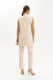 Жилет женский из смесовой костюмной ткани на подкладке полуприлегающего силуэта. Жакет двубортный на одну обметанную петлю и одну пуговицу. Перед имеет два прорезных кармана в рамку с двумя обтачками, а также на груди располагается карман с листочкой. Жилет с бочком. Спинка имеет средний шов и шлицу по низу изделия. Горловина обработана пиджачным воротником. Жилет без рукавов. В жилете имеются отделочные строчки в виде "ручного стежка” по воротнику, уступу лацкана, лацкану и по краю борта. Длина жилета чуть ниже бедер. Очень красивый и утончённый жилет с которым вы сможете создавать множество модных образов.
