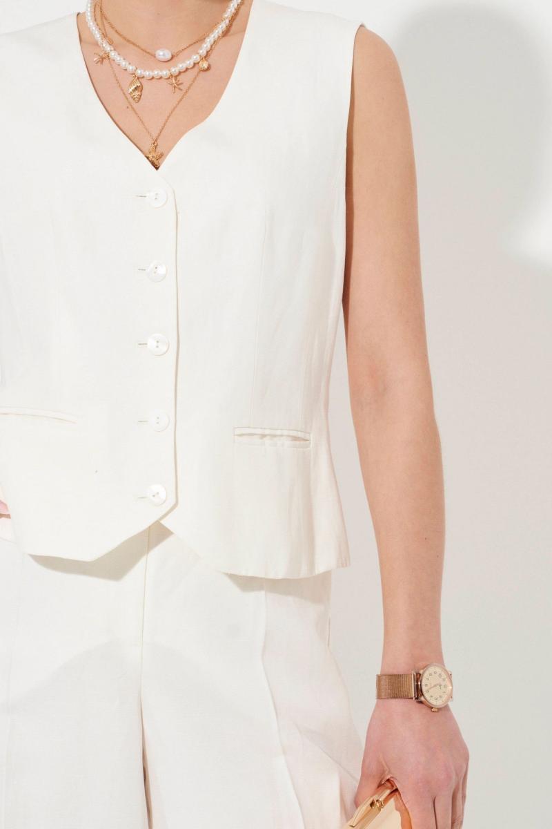 Жилет женский в классическом стиле бренда Ketty - современная база женского гардероба. Классический жилет выполнен из льняной ткани с V-образным вырезом, полуприлегающего кроя, подходит для образов в офис, в университет, в школу, на каждый день. Жилетка короткая на пуговицах имеет подкладку из вискозы, ее можно надевать под пиджак как первый слой (тренд сезона), под кардиган, а также сочетать с шелковыми топами, блузками женскими, водолазками, рубашками. Дополни жилеткой классическую прямую юбку, юбку мини, женские прямые брюки или брюки палаццо и даже джинсы!