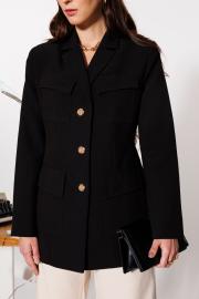 Жакет в стиле милитари – это изысканность и лаконичность в одном флаконе. Жакет приталенного силуэта с обрисованной талией. По переду расположены карманы с клапаном. Застежка центральная на дизайнерские золотые пуговицы. Сзади в среднем шве спинки расположена высокая шлица. По низу рукава, так же расположена шлица с пуговицей. Если вы хотите выглядеть роскошно – этот жакет для вас. Длина изделия – 70 см