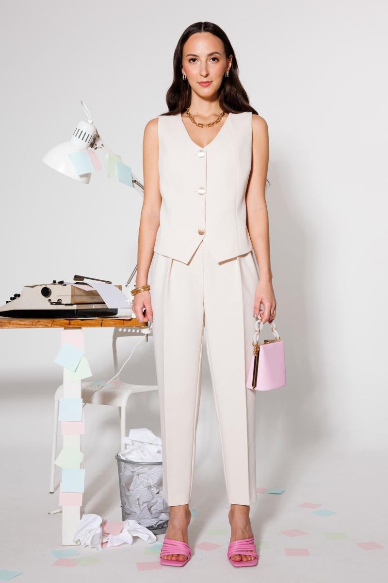 Лаконичный жилет с приталенного характера. Его мы создали из плотного поливискозного материала. Такой можно носить самостоятельно благодаря классической пройме и аккуратному вырезу или в составе костюмных образов. Строгость образу придает хлястик по спинке. Застегивается на дизайнерские золотые пуговицы с эффектом потертости. На подкладке. Длина - 49 см.