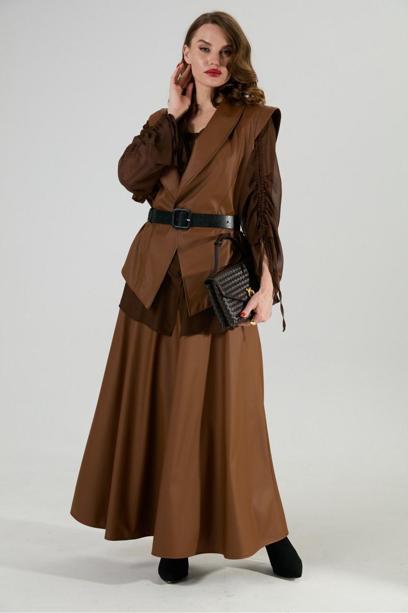 Жилет удлиненный свободного прямого силуэта, воротник пиджачного типа. Линия низа по переду и спинке фигурная ассиметричная. Короткий рукав-крылышко. Талия фиксируется съемным ремнем из экокожи, для которого в боковых швах оформлены шлевки. Ремень идёт в комплекте к изделию.