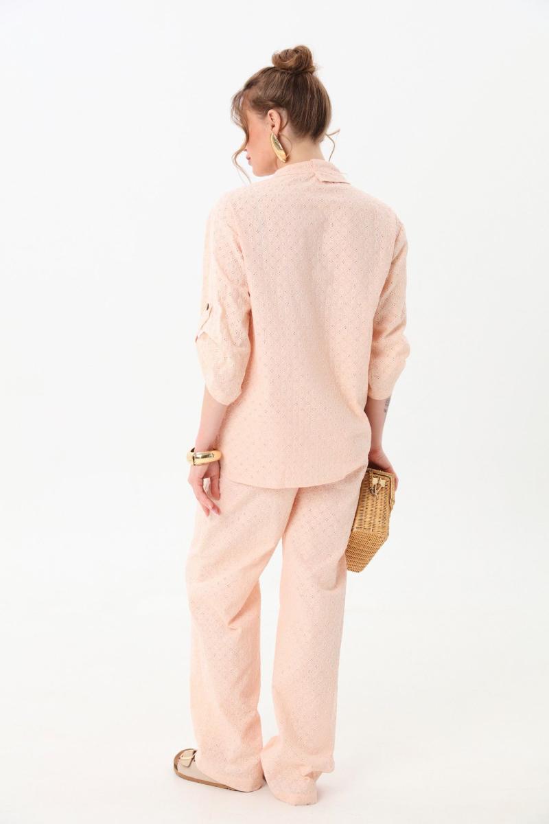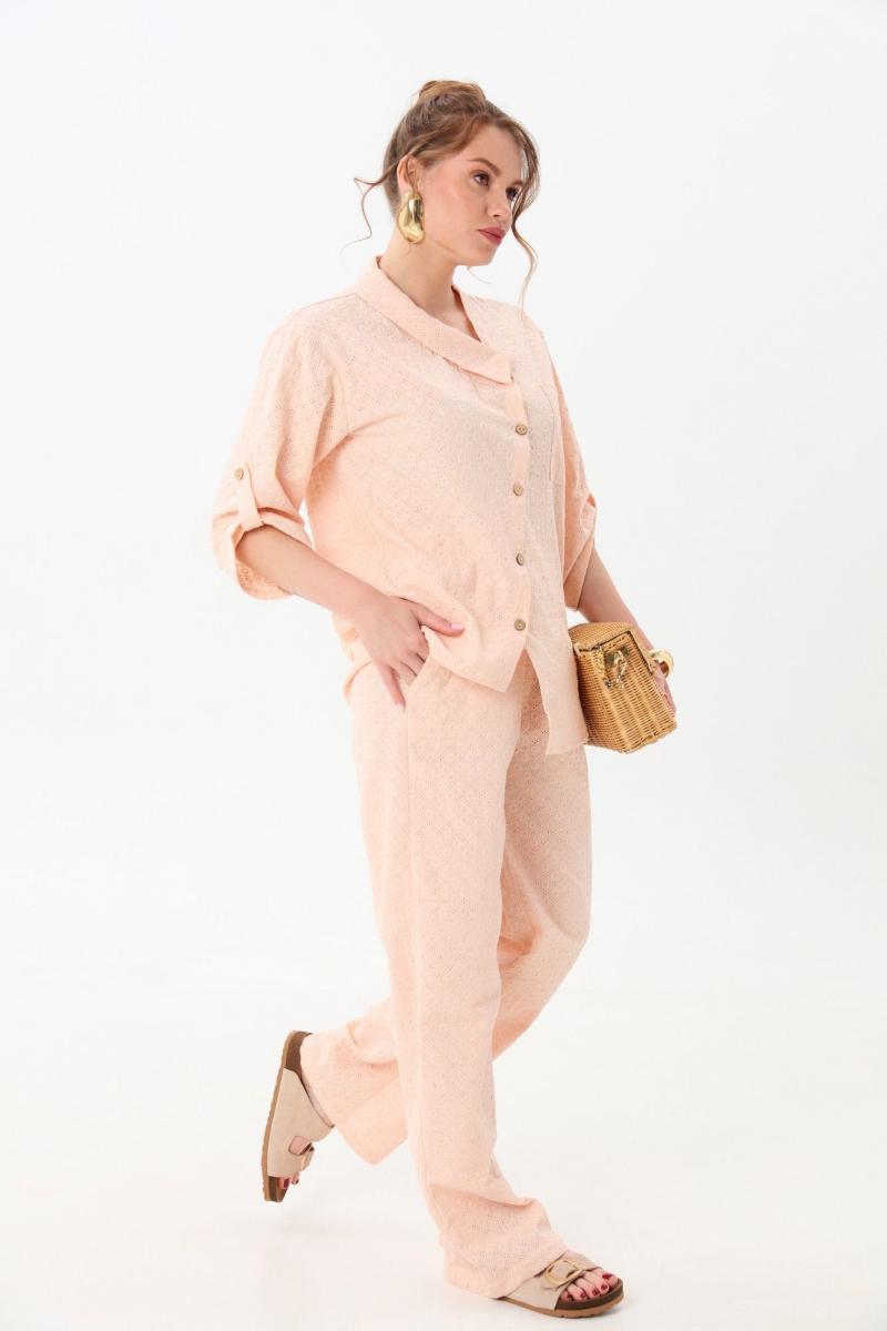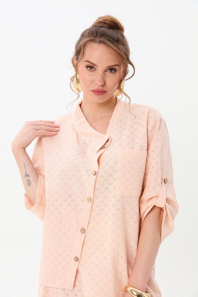 Жакет рубашечного типа прямого силуэта с асимметричным низом. Рукав втачной со спущенной линией плеча, фиксируется на пату. Застежка центральная на петли и пуговицы, смещённая по косой. На левой полочке накладной карман с клапаном. Воротник отложной на стойке до половины спинки.